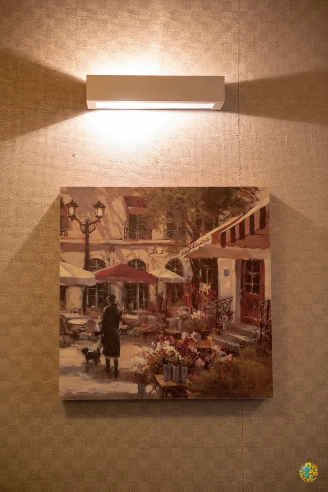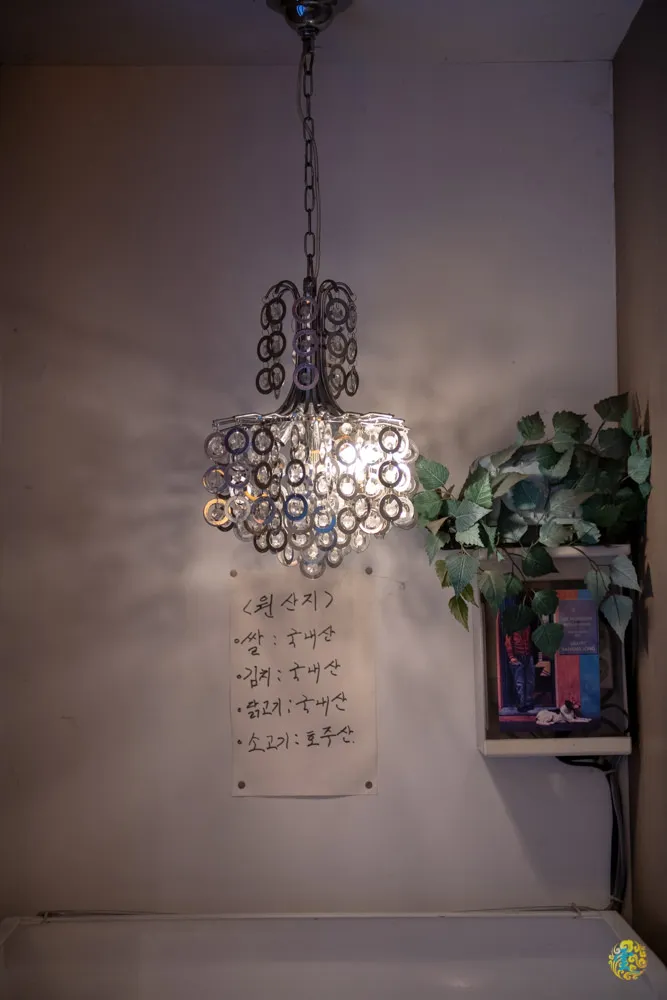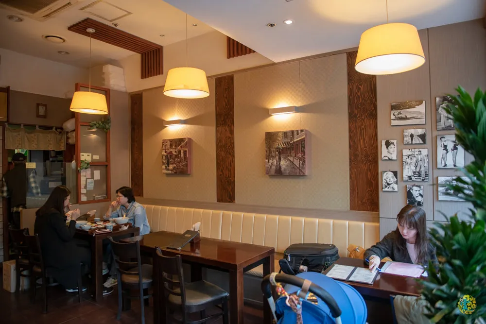 자연 죽 天然粥的大門其實還蠻醒目的,碩大的粥字直接點名主題,門口還以韓文英文與中文標示了『正宗韓國傳統粥專門店』,也因為這幾個字吸引了女王的注意,想讓小凌雲喝碗暖暖的粥品,所以進來了,最後發現這個決定是正確的。店內裝潢與照明都採用溫暖的色系,在寒風刺骨的當下給了視覺上溫暖的感受,實際進入店內也著實溫暖許多。略帶復古的優雅裝潢設計,牆上掛著風景水彩畫與著名的歐美老明星照片,其實你壓根也不會聯想到這是一間粥品專門店。店內總共只有四個4人座位與一個雙人座位,約可容納20位客人。