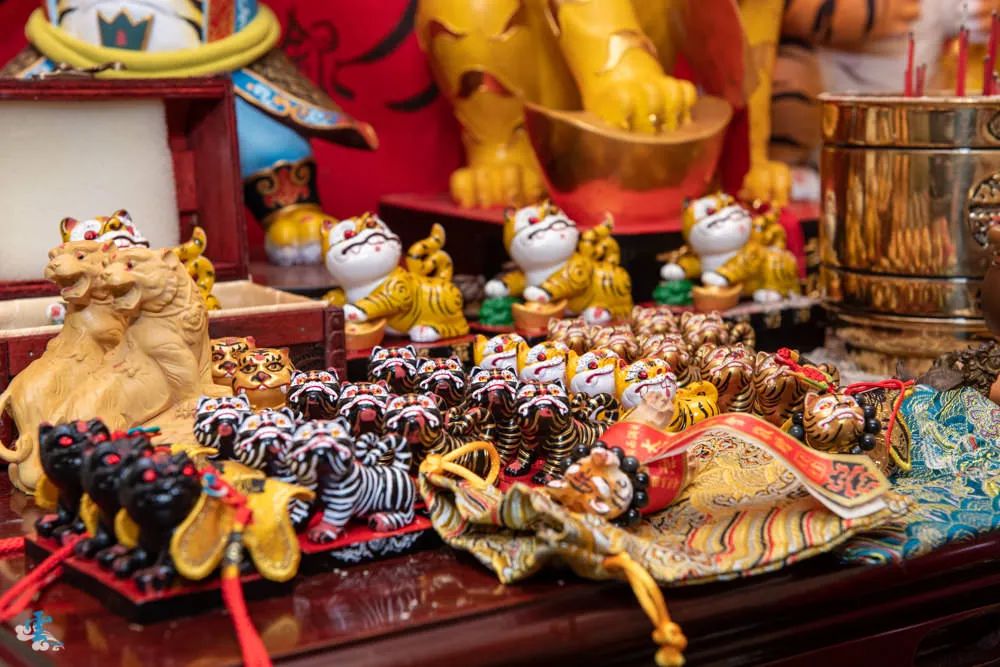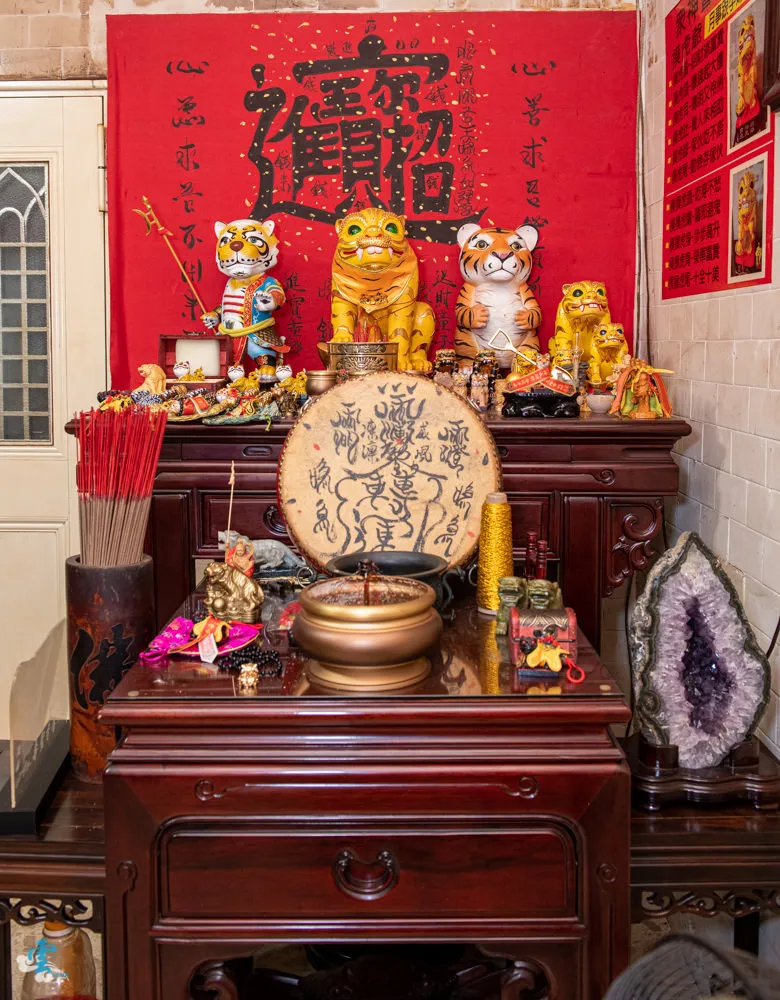 在最後方的問事廳,一進去就會看到三尊威武又可愛的虎爺,說神明可愛不知道會不會不敬,但真的就有那種感覺,桌上還有眾多可以隨身攜帶的小虎爺。三尊威武的虎爺分別是戰天虎、僻天虎與竄天虎,各具特色的扮相讓人印象深刻。來這邊記得先拿起一旁的鼓棒敲打前方的鼓,讓你增添運勢,記得只能敲三下喔,因為二叔說敲四下就變四大皆空了~哈。來了也記得摸摸僻天虎王,但是要記得孕婦與月事中的女性請勿觸摸。桌上有眾多的隨身型虎爺,分別有僻天虎、竄天虎、戰天虎與玄壇虎,虎爺的眾多神蹟除了新聞裡說的,現場還有不少有請供過的信徒,都能跟你滔滔不絕的說個三天三夜呢。請供虎爺很簡單,全靠你的眼緣,看你喜歡桌上的哪一尊,在跟現場服務人員說,提供你的名字跟生日,然後在請二叔做主就可以帶回家了,供奉的方式也很簡單,只要生雞蛋跟清水即可。 僻天虎王指示,往後每年農曆11月11日為虎王聖誕,於當天晚上8點舉行聖誕派對,除了點心之外,由眾神會準備36天罡紅蛋(36顆),在祭拜後供眾善信享用,今年的虎王聖誕是國曆12月6日,就在下個月初,有興趣的可以前往共襄盛舉。