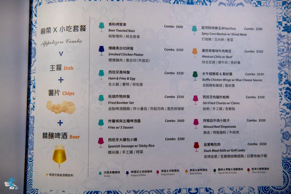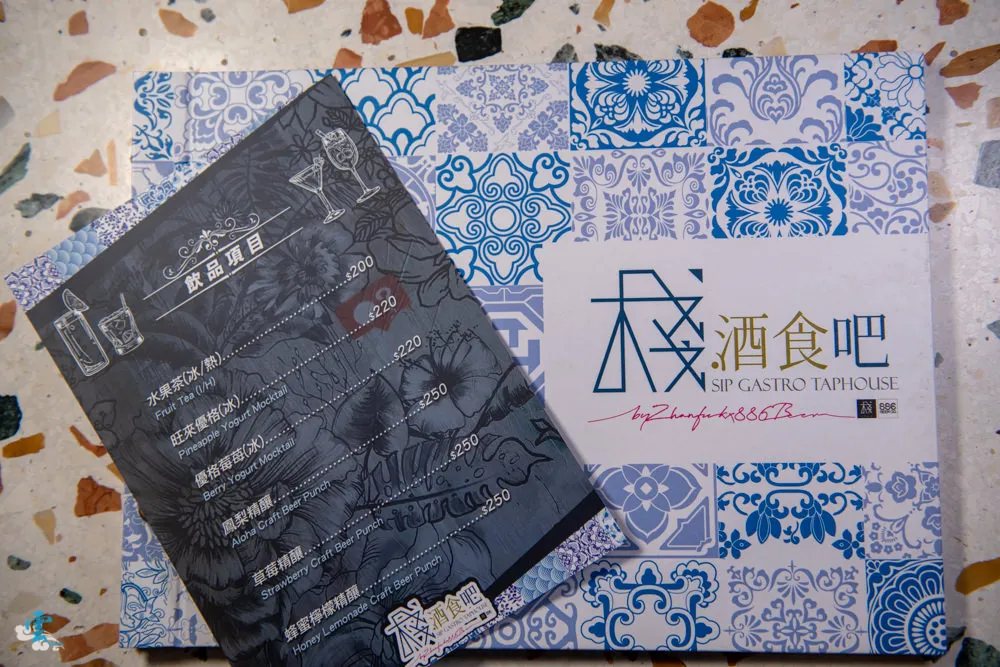 SIP GASTRO TAPHOUSE 的菜單設計,以特色拼花效果為背景,搭配詳盡的圖文解說,翻閱起來格外賞心悅目。與『886 Brewing Co.』釀酒廠合作的精釀啤酒,共有七大類不同風味,選擇好喜歡的風味啤酒後,再選擇來自美國、墨西哥、泰國、越南、阿根廷、西班牙以及台灣等世界各地美食,店家很貼心地都會給予組合的建議。每杯都是450ml,價格約莫NT220~280之間。