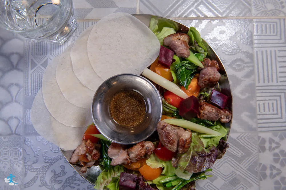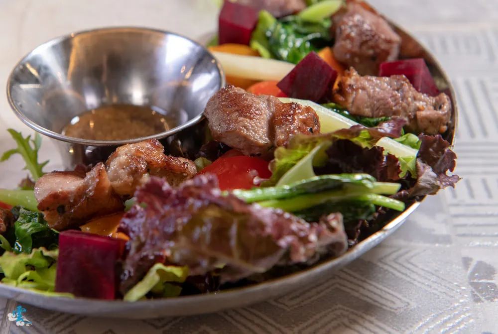 這道聽說是店內的人氣餐點,將宜蘭櫻桃鴨胸在鐵板上香煎過後放入烤箱,微焦酥脆的鴨皮,帶汁鮮甜的鴨肉,碳烤過的韮蔥、羽衣甘藍、洋蔥等蔬菜意外的甘甜,全部包裹在潤餅皮中一起入口,豐富多層次的口感令人驚豔,沾著一旁店家特調的白蘭地柚子醋,風味更佳。