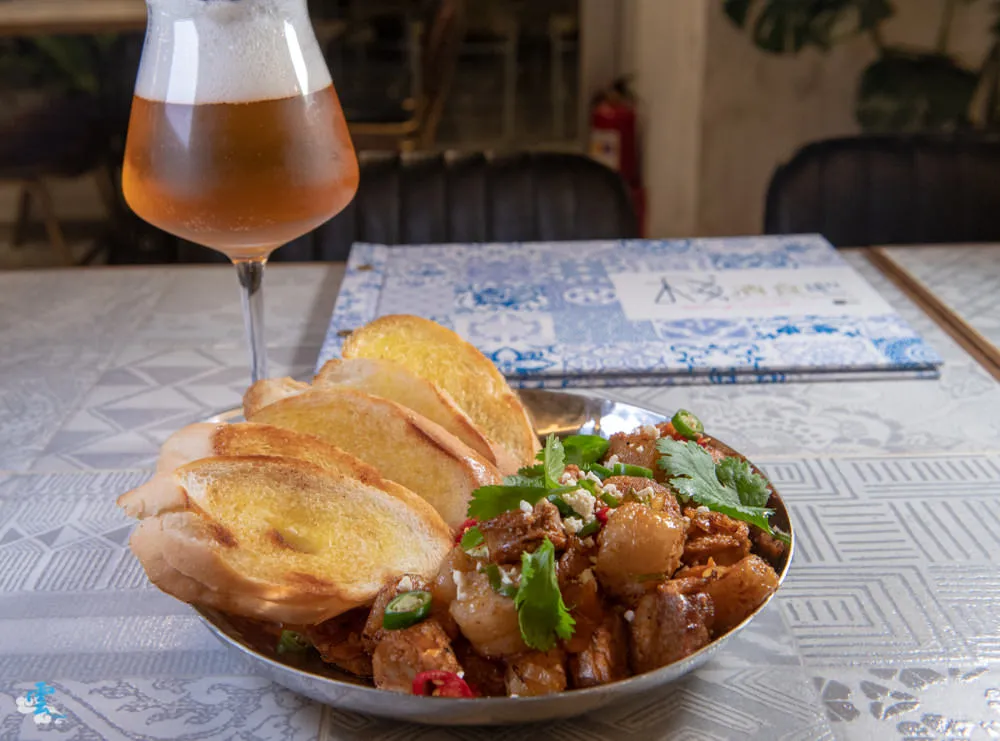 這道台式的街邊小吃,在主廚的巧思下有了不同的面貌,將糯米腸與德式香腸加上香料、辣椒與蒜末一起拌炒,最後撒點香菜提味,一上桌蒜香與肉香就讓人食指大動,色澤相當誘人,香辣酥脆帶點微酸的滋味卻不油膩,搭著金黃酥脆的麵包切片,帶來更豐富的口感與風味。