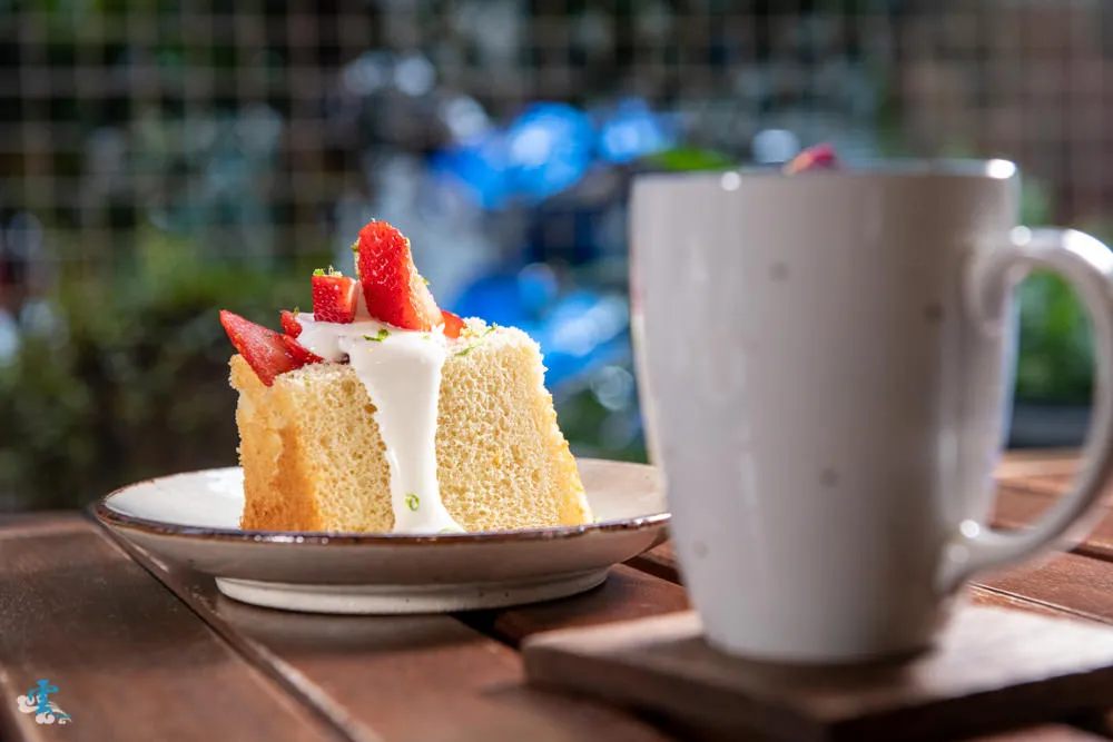 這是當日手作甜點之一,每日手作甜點會不定期更換項目。蛋糕體口感濕潤層次分明,剔透色澤的鮮甜草莓,配上不甜膩的優格,毫無修飾的甜美點在舌尖,這份溫柔美好的滋味,豐饒甜美在齒頰之間,令人食指大動的奇妙幸福,讓人意猶未盡。
