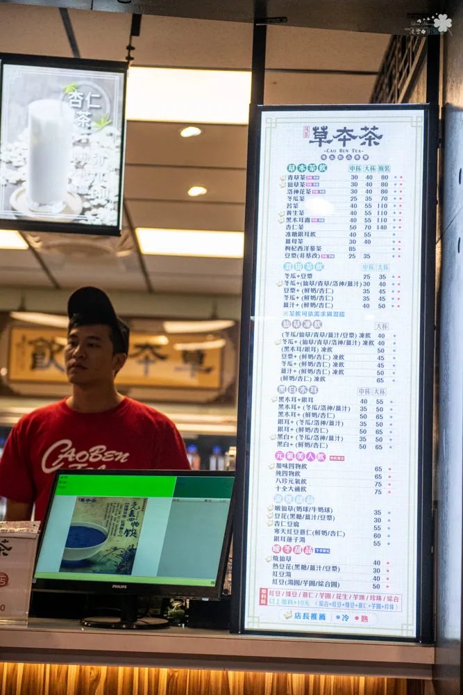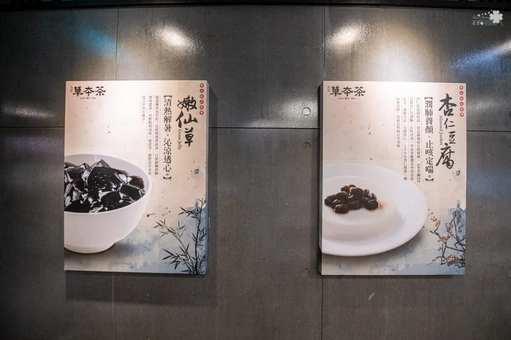 圖|牆上掛著草本茶大推的四種飲品-嫩仙草、杏仁豆腐。