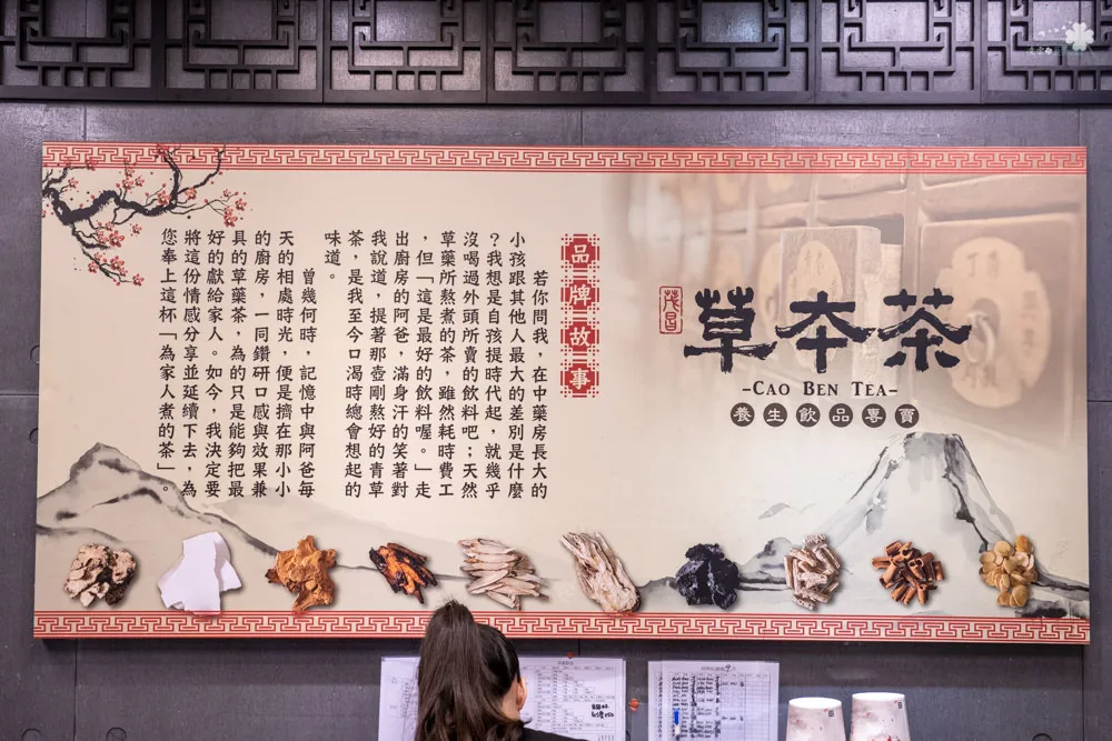 圖|店內斗大的看板述說著草本茶的品牌故事。