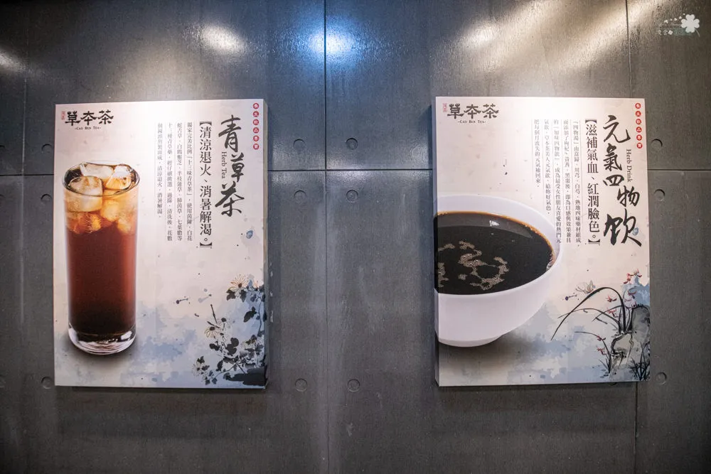 圖|牆上掛著草本茶大推的四種飲品-青草茶、元氣四物飲。
