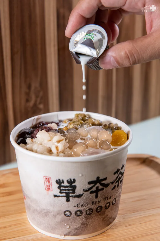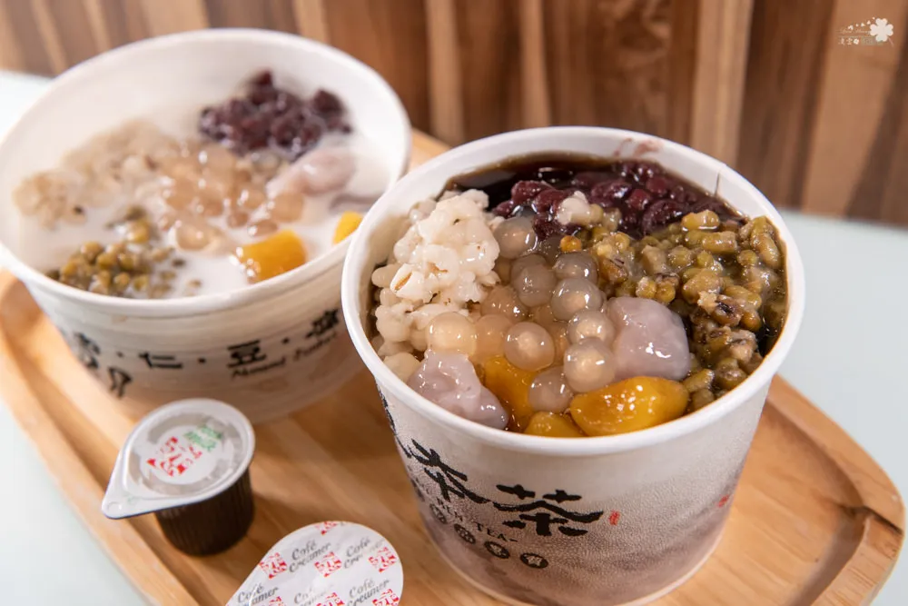 杏仁營養價值高,草本茶選用100%南杏熬煮製作,遵循古法使用石磨杏仁,真材實料無添加香精,是最天然的古早美味。杏仁茶是店內人氣飲品之一,這次我們加價選擇綜合加料,所以多了很多好料,有紅豆、綠豆、薏仁、芋圓以及珍珠,每種材料都是氣味香濃、口感迷人,店員表示他們的芋圓跟珍珠,如果沒賣完的話,每三個小時就會丟棄以確保材料的新鮮美味,真的是不惜成本,只為了給消費者最棒最新鮮的品味感受。草本茶的杏仁有著淡淡的清香,吃起來滑嫩軟Q不甜膩,不會像一般坊間水水的不好吃,加上綜合配料,一碗給你大大的滿足。