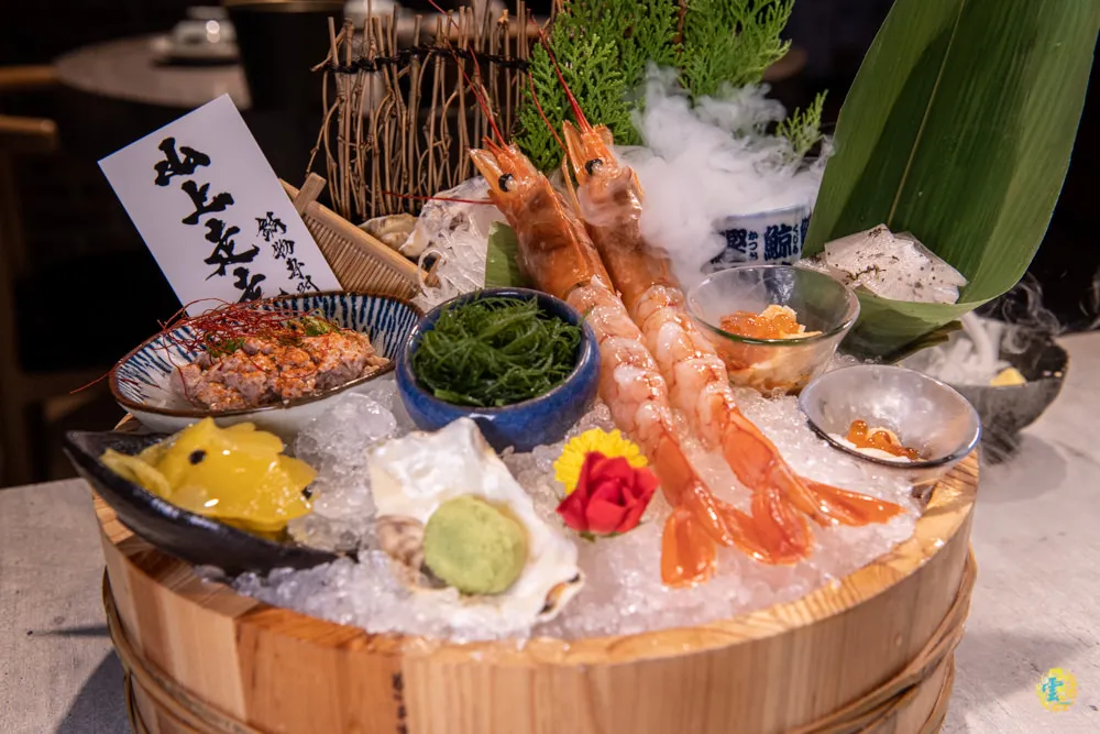 看著服務生端上一大盤的海鮮冷盤,內容相當豐富,有鱈魚肝佐和風柚子醬、百香佛手瓜、海藻絲、天使紅蝦、紫蘇蘿蔔與山藥佐鮭魚卵。有和風柚子醬與辣椒絲提味的鱈魚肝,軟嫩鹹香伴著清爽的柚子味;酸甜開胃的百香佛手瓜,脆口爽快;海藻絲脆爽Q彈的滋味,需要細細品味;肥美的天使紅蝦,口感細嫩鮮美;一樣相當開胃的紫蘇蘿蔔,些微的甜酸帶點紫蘇淡雅的香氣;店家都配好醬料的山藥佐鮭魚卵,涼爽清香的滋味,會讓人想再來一碗。