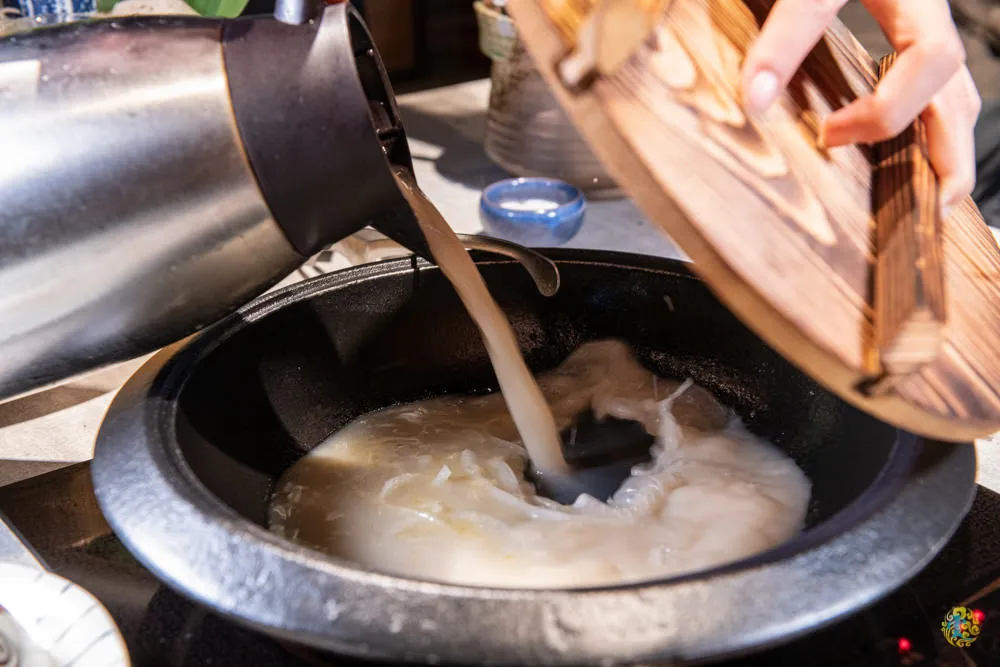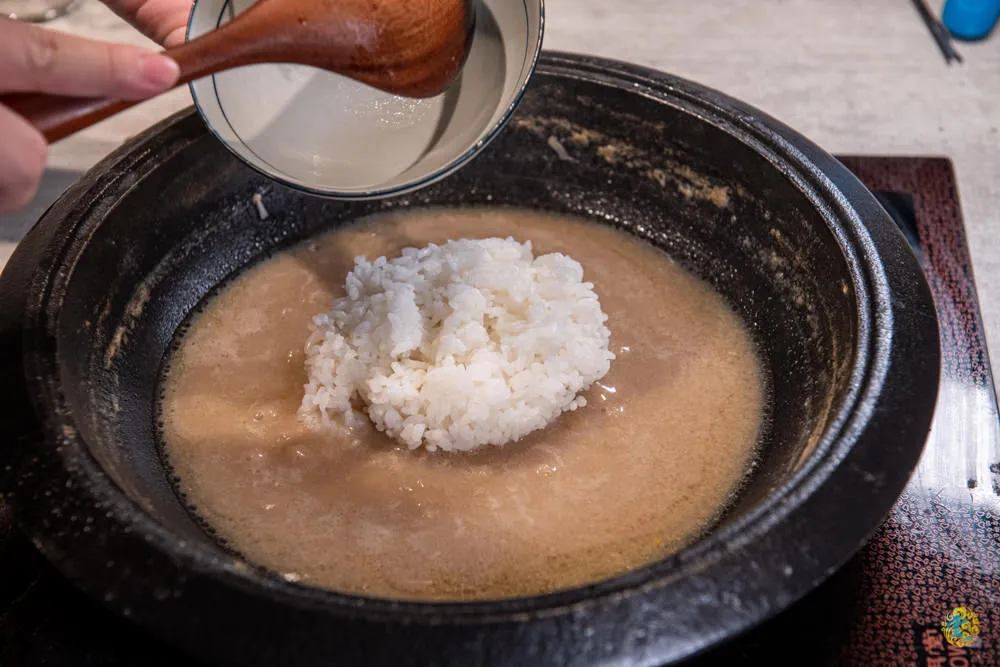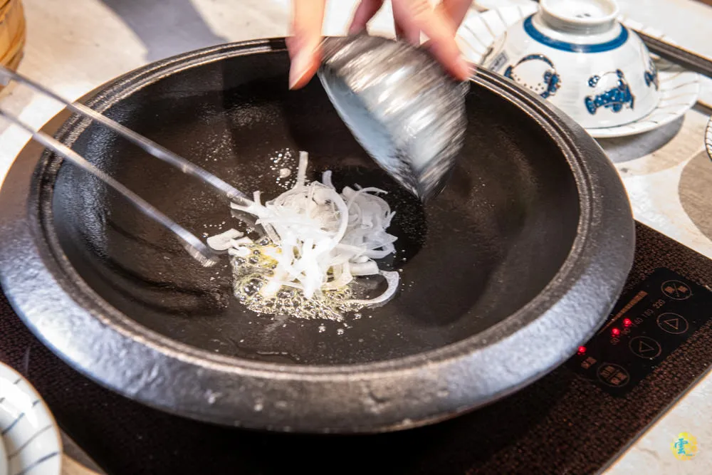 服務人員在鍋底塗上一塊奶油起司塊,在倒上一碗洋蔥切片,最後倒入寺味噌湯,倒上鍋蓋後,等候湯滾。