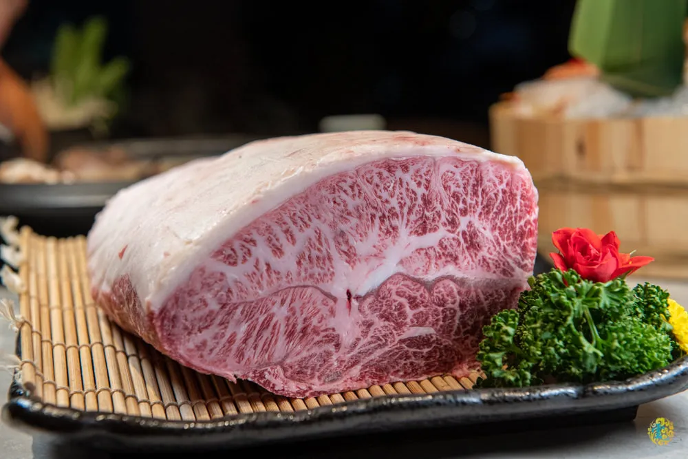 對於食材品質的嚴選把關是山上走走的堅持,廚師特別把來自日本鹿兒島,知名的A5和牛展示給我們看,相當大塊的和牛原肉色澤鮮艷,在肌肉纖維之間很明顯可以看得出交雜混入了的脂肪,牛肉的結實度與紋理很優,這種油花均勻分佈的霜降脂肪不只風味濃厚,口感更是一級棒。