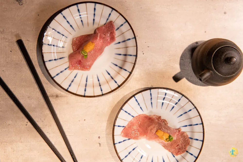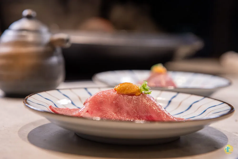 炙燒過後,只透過鹽蔥簡單的提味,讓你直接享用食材本身的風味,牛肉底下是沒有任何調味的米飯,能增加些許口感。這是道研發中的菜色,廚師還在做味道上的調整,廚師有特地前來詢問食用後的感想與建議。
