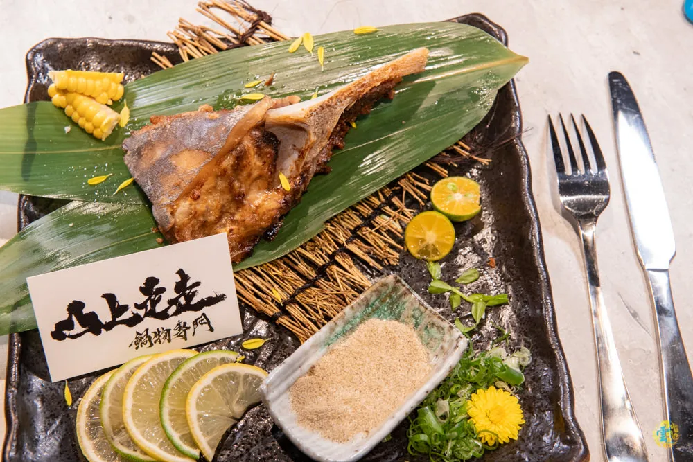 有著豐富油脂的劍旗魚嘴邊下巴肉,魚骨也挺大塊的,燒烤過之後香氣迷人,口感細嫩彈牙,多汁的肉質輕輕一咬就化開了,沾點椒鹽讓香氣更加出色,擠點檸檬提味能讓魚肉更添風味。