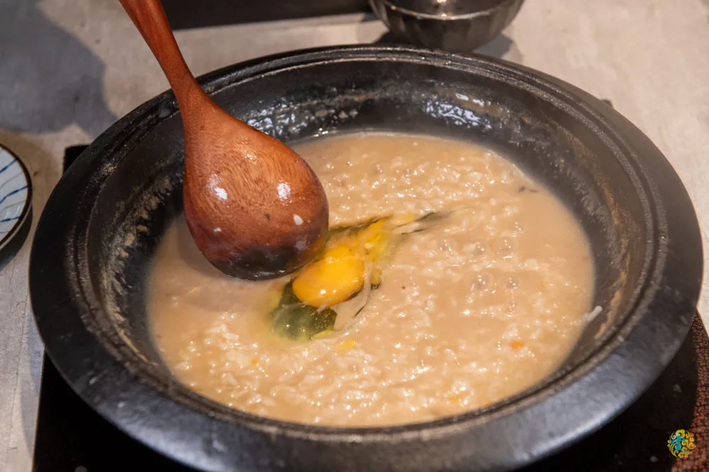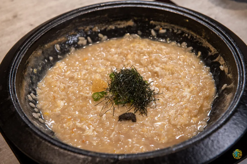 最後的重頭戲就是松露海鮮雜炊粥啦,店員會事先詢問喜歡濃一點還是稀一點的粥,還有希望的鹹度,一般來說做完雜炊粥,會比原先的湯頭還來的鹹一點點,所以這個部份就要自行考量了,當然如果最後還是覺得太淡或太鹹,服務人員還是可以再調整。首先把湯內所有食材都取出,只剩已吸取海鮮、和牛與各式蔬果精華的湯底,在倒入越光米均勻攪拌後打上顆蛋,最後撒點青蔥、海苔絲、飛魚卵與松露,接著在攪拌烹煮就成了一鍋超美味的日式海鮮雜炊粥。米飯吸飽了海鮮與蔬果的精華,蟹膏與和牛融合的氣息盈滿鼻尖,絢爛的滋味讓人感受幸福又溫暖。