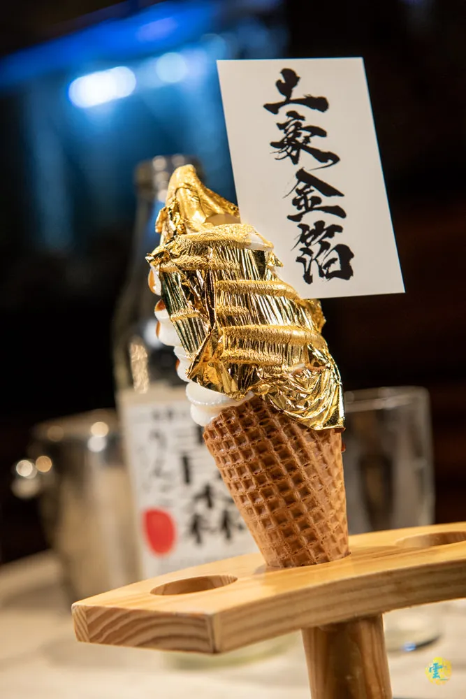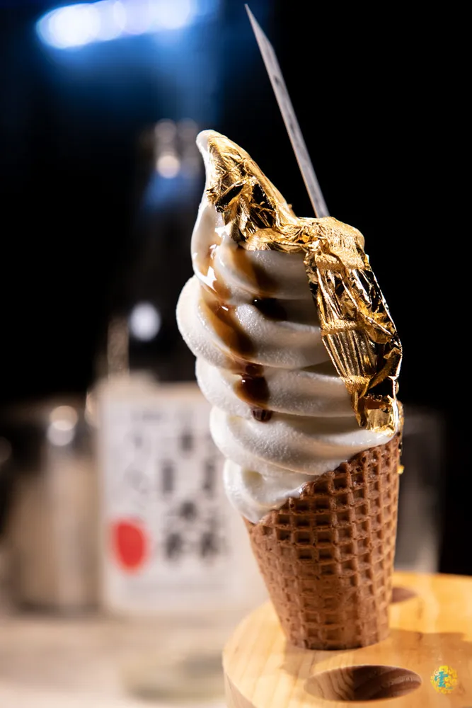 最後的甜點是金箔冰淇淋,充滿視覺衝擊力的甜點,本質是北海道焦糖牛奶冰淇淋,店家毫不手軟的鋪上大片食用金箔,視覺校果十足的金箔,吃不太出來他的味道,香醇的牛奶冰淇淋搭著醇厚的焦糖,甜而不膩的滋味在舌尖打轉,綿密的口感成就經典好滋味,如此華麗的誘惑,女孩們一定很難抵抗。