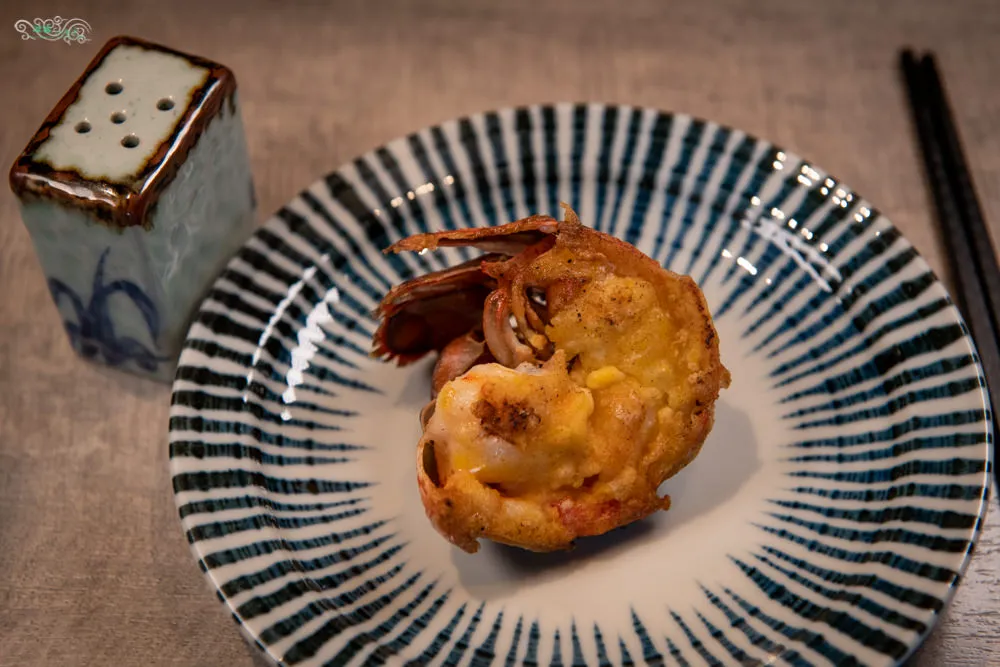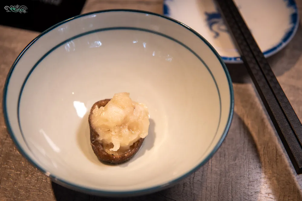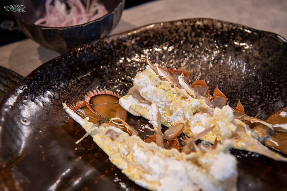 用餐中段端上來的海鮮冷盤,內容相當豐富,有天使龍蝦、鱈魚肝、水雲菜、百香果佛手瓜、黃金花枝與山藥佐鮭魚卵。天使龍蝦肥美的鮮度,口感軟嫩細緻;上方擺放辣椒絲的鱈魚肝,吃起來相當清爽,有著如同嫩豆腐般的咀嚼感受;柔軟黏滑的水雲菜,滑溜溜又冰涼的口感;用百香果去醃漬的佛手瓜,酸甜開胃;金黃色的黃金花枝,Q嫩又帶點脆度,口感跟滋味都十分引人入勝;山藥佐鮭魚卵,店家把醬料都搭配好了,可以直接食用,有種獨特的清香鮮味,很涼爽的感受。