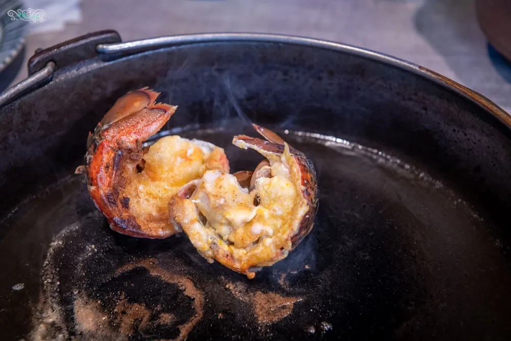 前菜剛吃完,就看到服務人員端上已裹好粉的龍蝦蝦尾,這是波士頓龍蝦第一吃,利用奶油香煎的方式處理,全程皆有服務人員協助處理。看著奶油起司塊在鍋裡滋滋作響,香氣濃郁逼人,接著把蝦尾入鍋,一瞬間就看到蝦尾捲曲跳動,然後蓋上鍋蓋悶煮數分鐘後,加點夏威夷火山鹽調味,Q彈鮮甜的蝦肉帶著滿滿的奶香,相當潤口,這大海裡的奢華美味,每一口都讓人超滿足。
