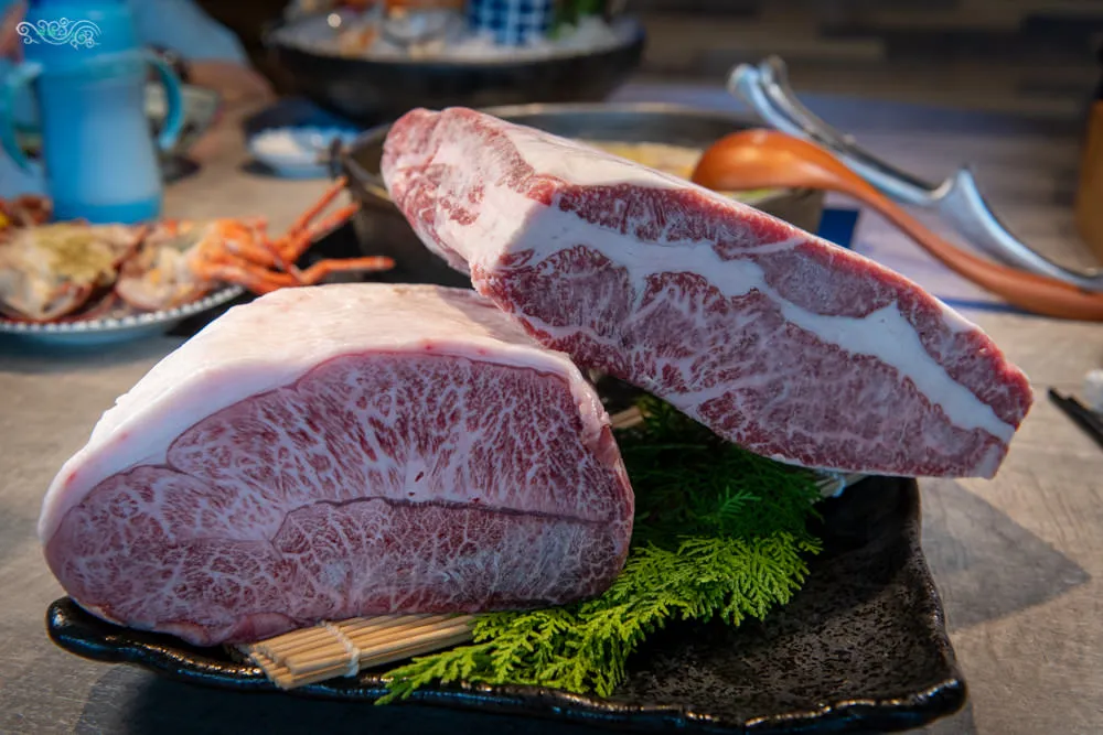 在端出肉盤之前,服務人員特別把來自日本鹿兒島,知名的A5和牛展示給我們看,分別是鹿兒島A5和牛五花與鹿兒島A5和牛板腱,超大塊的原肉看的出來在肌肉纖維之間交雜混入了脂肪,這種霜降脂肪不只風味濃厚,口感更是一級棒。在肉盤上左上方是A5和牛牛五花,右上方的是A5和牛板腱,下面的則是美牛肩小排,正中間的是醬料,選用石安牧場的蛋黃搭配海膽,攪拌均勻後,等食材熟了再沾來吃,和牛建議5分熟即可。A5和牛入口即化的口感超讚的,每一口都讓人融化,頂級的美味撩動你味覺的最大值,沾點海膽蛋黃將和牛的清甜帶上另一個層次。如果不吃牛肉的朋友,店家也能將肉品更換成雞肉或豬肉。