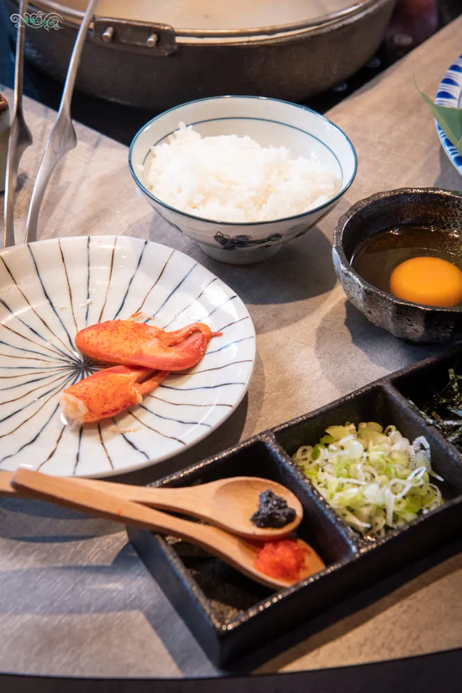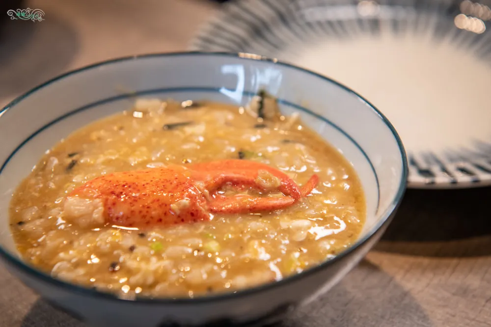 煮雜炊粥的原料有越光米、蛋、飛魚卵、黑松露、青蔥、海苔絲與蝦螯,再次上桌的蝦螫是已經剝好殼的模樣。已吸取龍蝦、和牛與各式蔬果精華的湯底倒入米飯後打上蛋,在烹煮一小段時間讓米粒更為熟爛點,接著在正中央擺上蝦螫,倒上松露與飛魚卵,在蝦敖周邊鋪陳蔥花與海帶絲,接著在攪拌烹煮就成了一鍋超美味的日式雜炊粥。和牛、龍蝦、松露與各式食材融合的氣息刺激嗅覺,在嘴裡綻放極盡奢華的滋味。