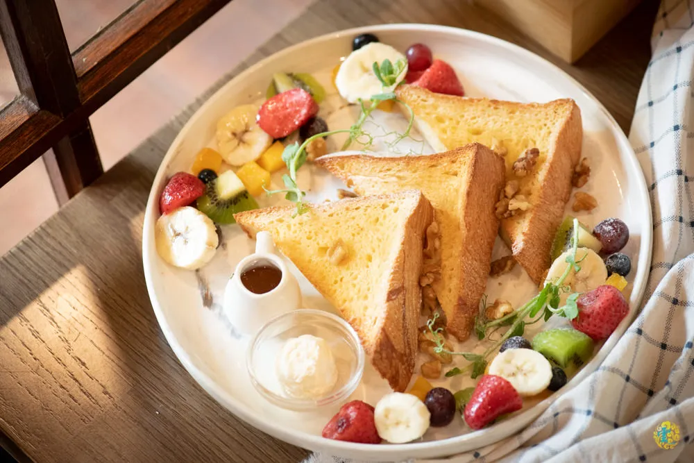 法式吐司與堅果彷彿走入,由草莓、葡萄、奇異果、香蕉、橄欖與水蜜桃組成的甜蜜派對中,蜂蜜醬傳唱甜蜜抒情的高音,奶油彷若低音BASS,一曲激昂彭湃的甜蜜交響樂在嘴裡恣意奔放。