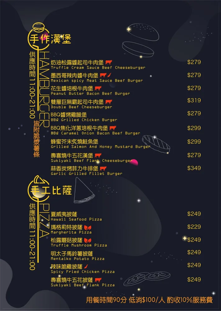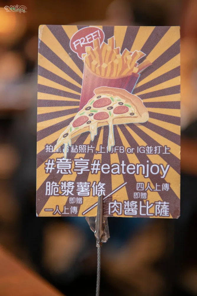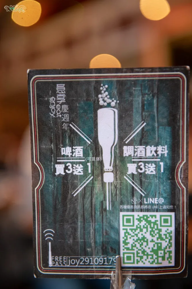 桌上擺放店家近期推出的週年慶優惠活動,拍照打卡上傳臉書或IG即贈薯條或披薩,啤酒與調酒飲料買3送1,可千萬別錯過囉。