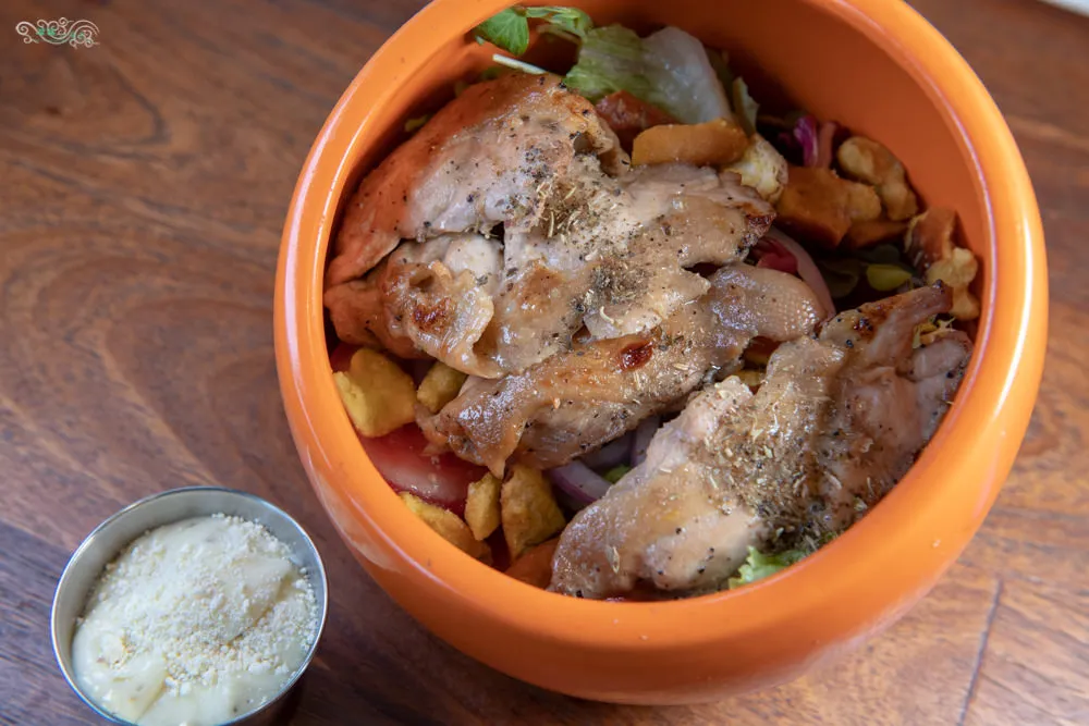 圖|色彩繽紛的沙拉,凌雲超愛蜂蜜芥末蝴蝶餅那酥脆的口感。
