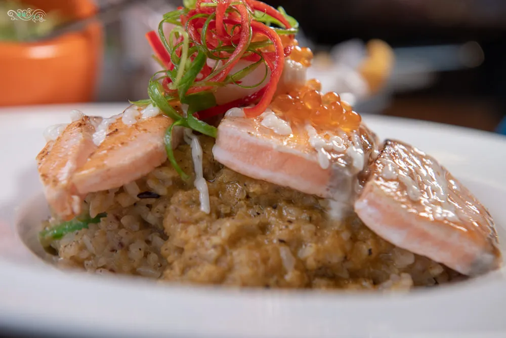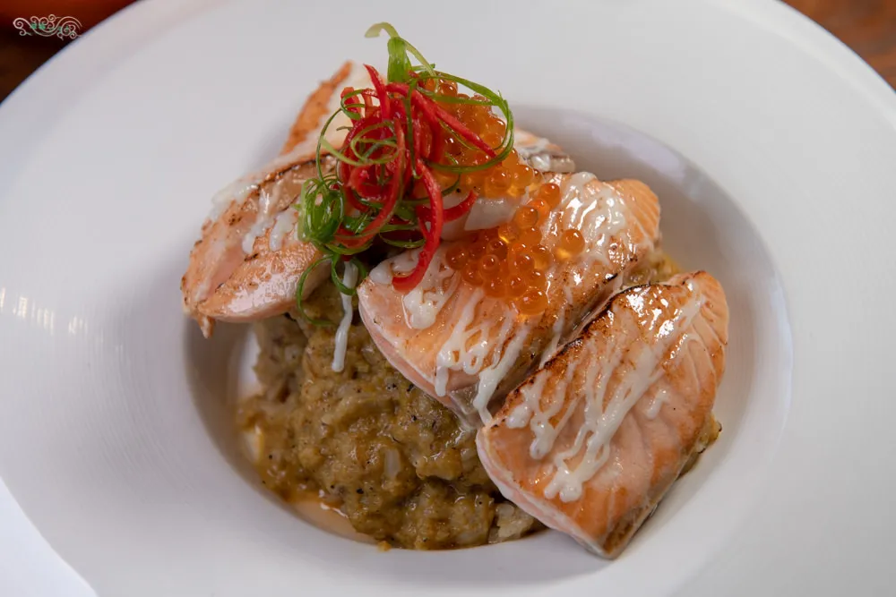 鮭魚柔嫩彈牙,入口銷魂,回甘的鮮味盈滿口中,搭一口紅咖哩燉飯果真絕妙組合,滿足味蕾的細膩層次,油脂清淡又有韻味的干貝,讓整道料理更添馥郁深度,餘韻綿長。