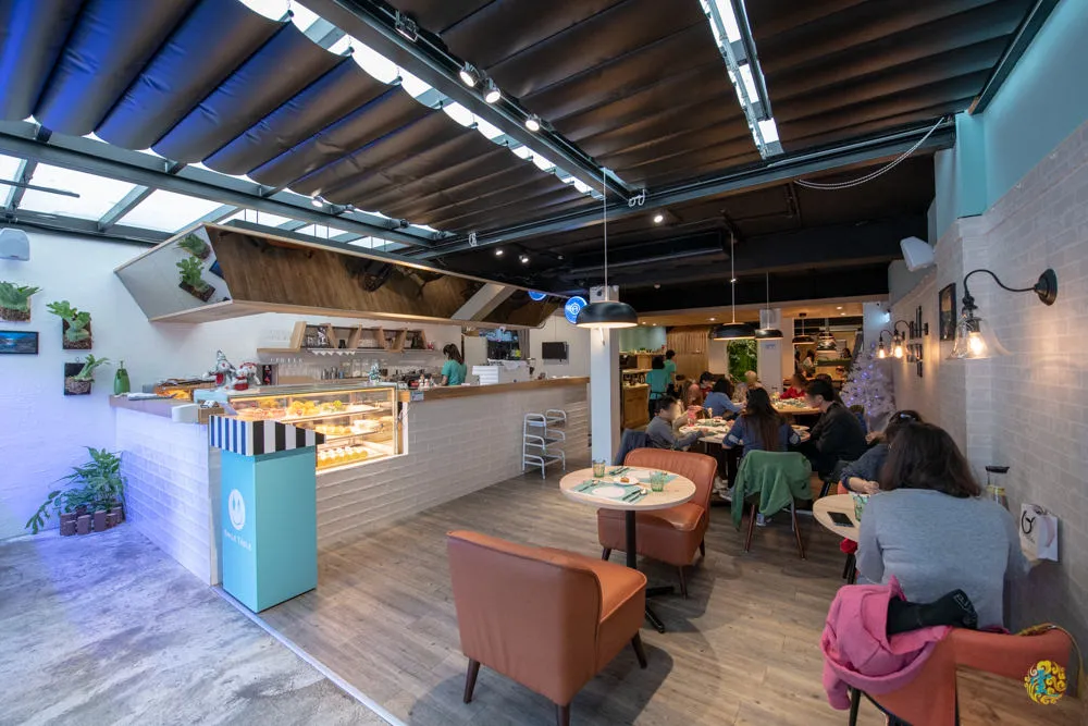 微笑餐桌採用簡約時尚的裝置藝術風格,以白色文化牆為主基調,佐以Tiffany綠、木質調帶來溫潤的柔和感,讓氣氛再次升級,黑色的天花板引導出空間的層次感,天花板的跳燈與牆上的掛燈,打造出視覺的焦點也提升了設計的豐富感,標準的北歐風格散發舒適純淨的輕鬆氣息。