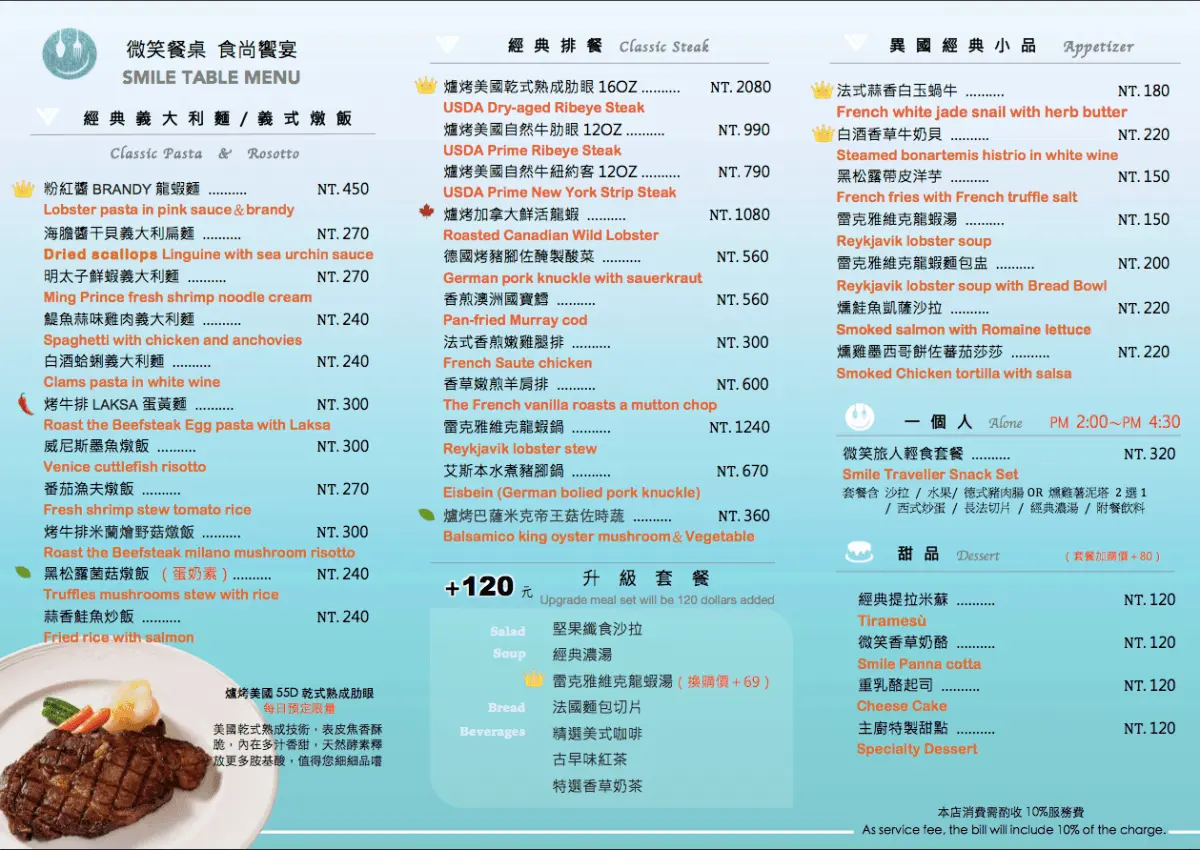 微笑餐桌的菜單以淡雅漸層的Tiffany綠為基底,看起來很舒服,整個菜單以餐點種類區為數個區塊,有經典義大利麵/燉飯、排餐、小品與甜點,飲品的選項也很多樣化,價位也都落在合理範圍內。