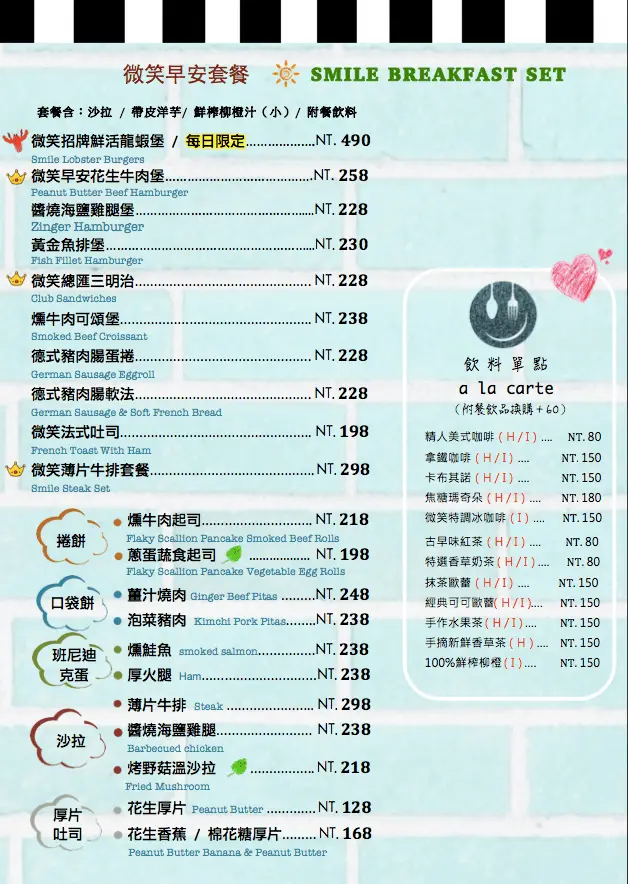 圖|微笑早餐套餐菜單,圖片來自微笑餐桌臉書粉絲頁。