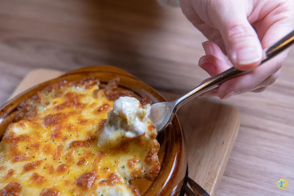 微笑餐桌的老闆特地跟彰化小品蝸牛簽約合作,引進身體雪白如玉的白玉蝸牛入菜,雖然成本更高,但是那脆口Q彈的口感相當吸引人,且高蛋白、零脂肪、營養價值高,有陸生鮑魚之稱的白玉蝸牛,搭配金黃誘人的焗烤蒜香起司,那濃郁的香氣牽引著味蕾,讓整體滋味更顯醇厚柔和且帶入豐富層次的口感,真是讓人飽足馥郁的美妙好味道。