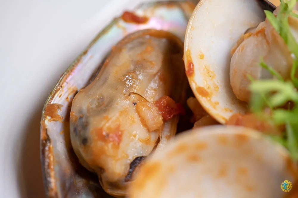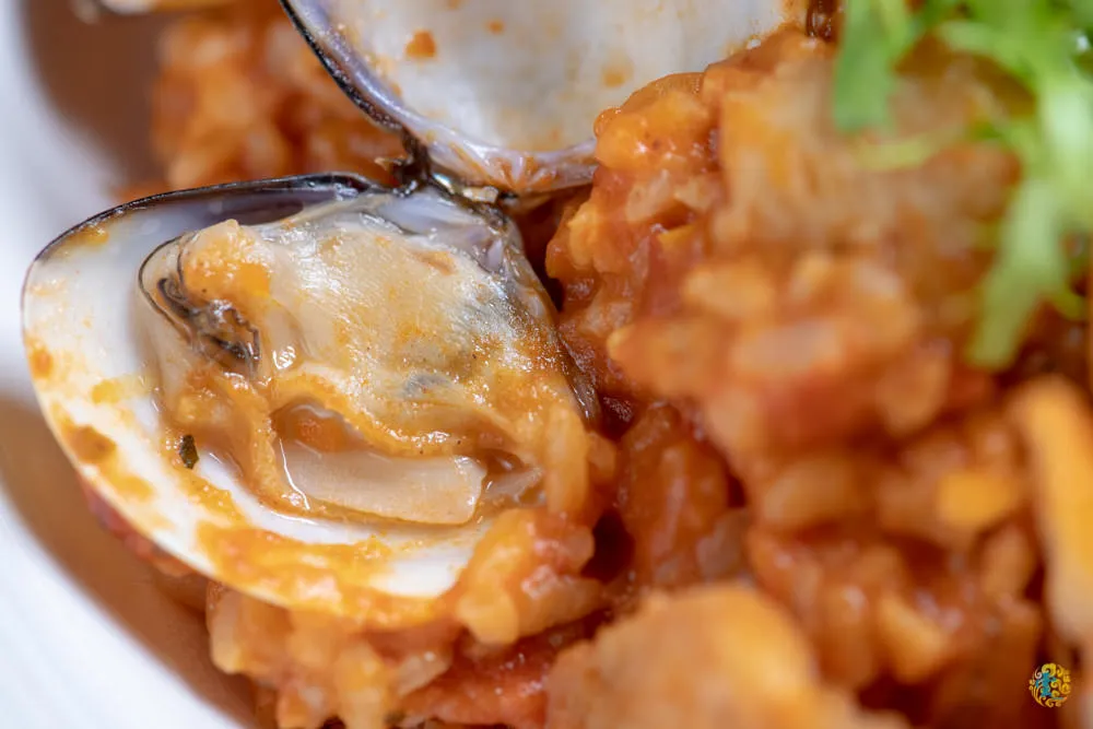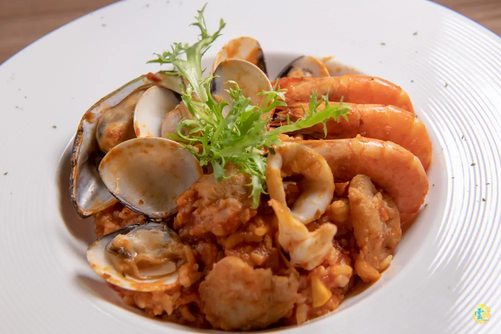 華麗的番茄漁夫燉飯,厚實肥美的蝦肉、海味十足的淡菜、鮮甜肉嫩的蛤蜊感覺都快滿出來了,燉飯雖然看起來綿密仍能感受到適切的米芯硬度,越咀嚼越是回味無窮。