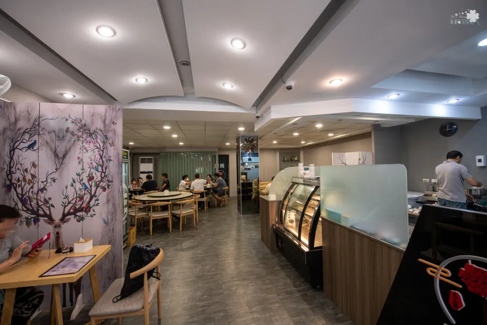 半開放式的廚房與餐廳連為一體,帶點視覺的延伸,大面積的門窗讓整體空間更為通亮,也由於大面積的窗戶,在店門外就可以看到老闆娘認真桿著麵皮的身影,也能清楚看到上方大型的菜單。以灰白色為主色調,搭配眾多餐廳喜愛的暖色系燈光,透過有著華麗圖案的屏風,製造視覺亮點,柱子上的大面貼鏡,利用影像的反射創造空間延伸,讓空間界線有種模糊的錯覺,這也是一種常見的空間變身的手法。