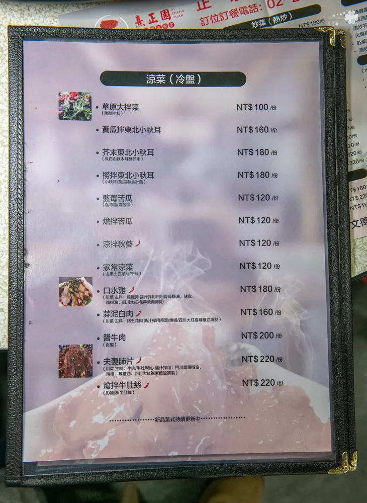 熹正園的菜單有新舊兩種,舊的菜單是類似一般合菜餐廳那種一本的樣式,新的菜單採用簡單風格,依據菜色種類做區分,簡單一張讓人一目瞭然。