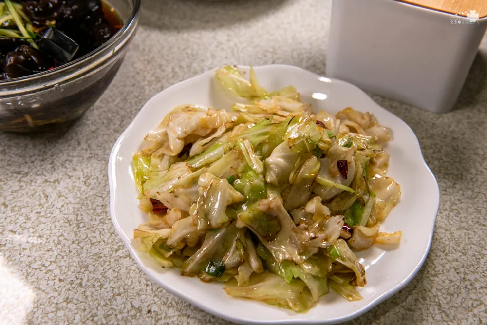 使用乾辣椒配上醋爆炒的高麗菜,柔軟的高麗菜葉還是帶著一點點的脆度,些許辣度帶著不甚明顯的酸味侵襲味蕾,吃得到蔬菜的清甜。