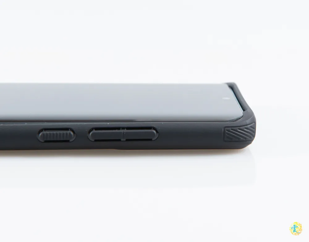 為了達到更完整的保護,凌雲這次也嘗試看看Spigen的Rugged Armor-軍規防摔保護殼,這款高CP值防摔殼,是Spigen旗下的經典款手機殼,採用碳纖維設計,黑色質感時尚,簡約設計俐落有型,主要材質是TPU,整體重量約30g,一樣相當輕便。