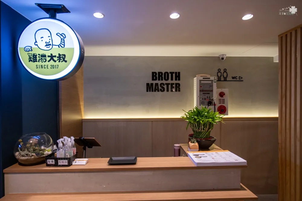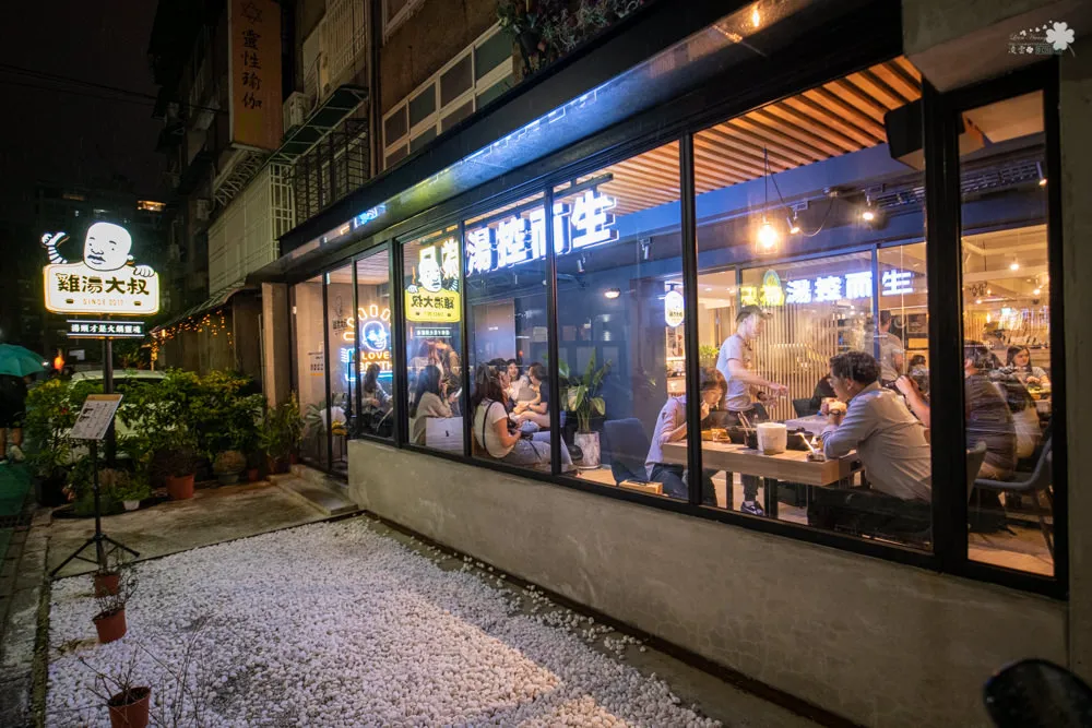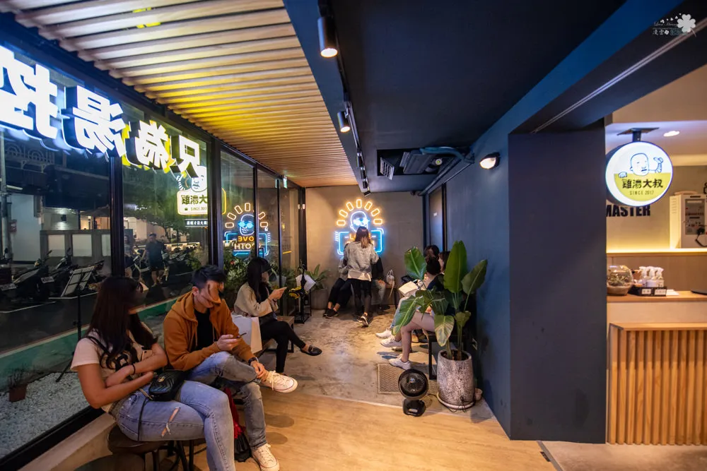 雞湯大叔鮮明搶眼的招牌,十分吸睛,整片落地窗的設計帶來明亮的採光,也延伸了視覺感受,採用裸露導線管、鐵件的輕工業風格天花板,牆面與天花板以白色為基調,搭配暖色系吊燈、投射燈以及木質元素,為用餐空間帶來溫暖感受。