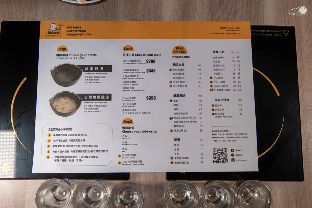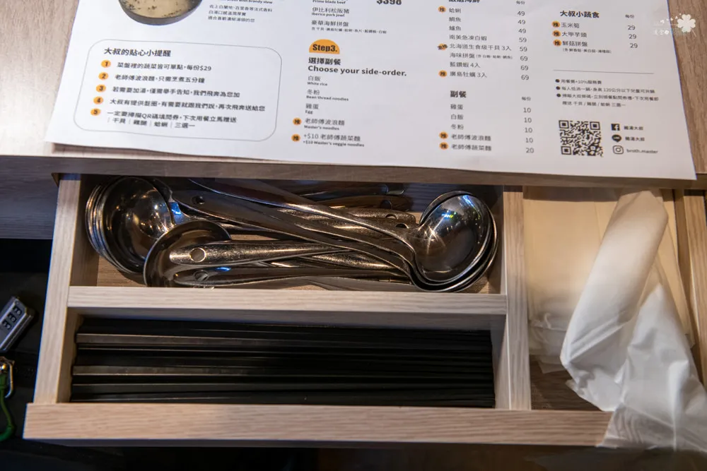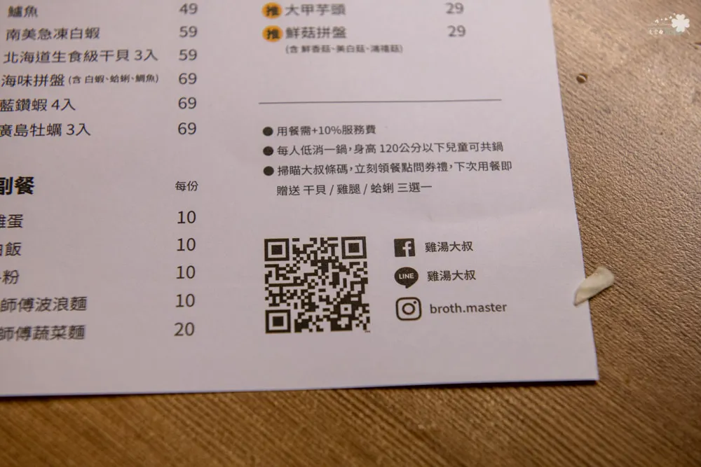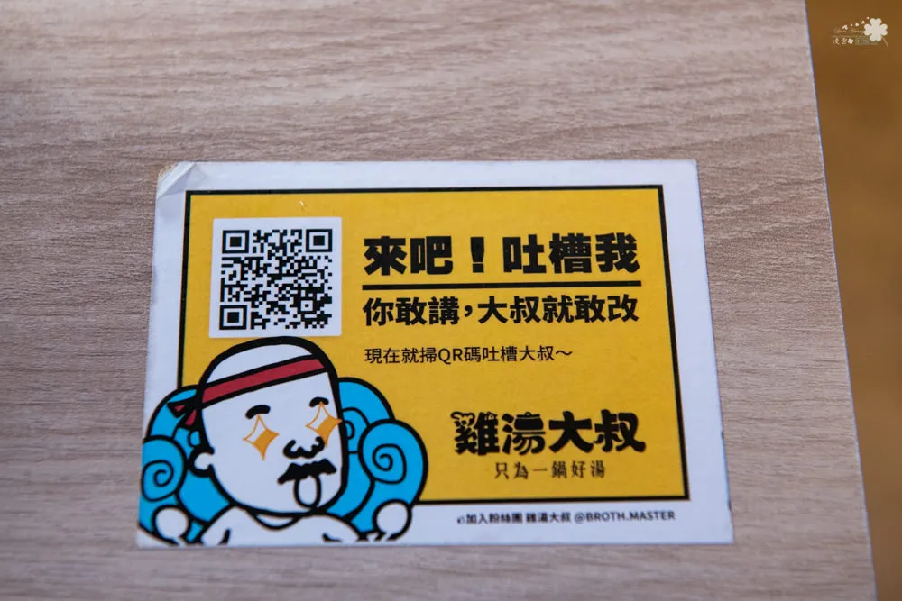 每張桌子旁都可以看到一組QR Code,如果有任何覺得可以改進的地方,雞湯大叔都歡迎大家告訴他,讓雞湯大叔可以提供更加完善的服務。每張菜單右下角也有一組QR Code,填寫問券後即贈送禮物卷一張,提供下次用餐時能免費兌換美味餐點。