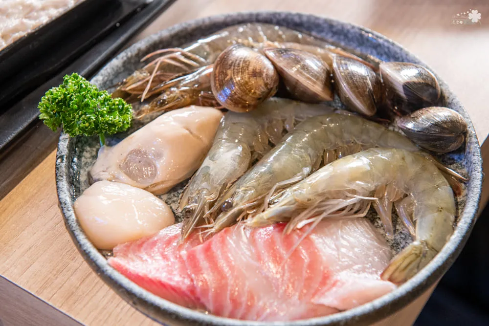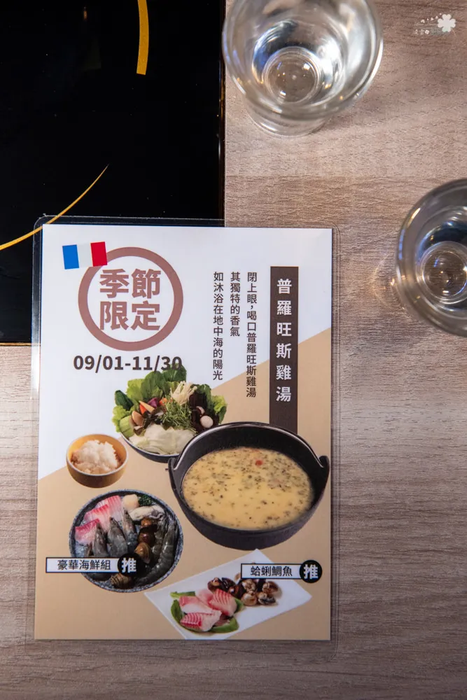收攏著藍鑽蝦、白蝦、干貝、廣島牡蠣、蛤蜊與鯛魚片的豪華海鮮珠寶盒,品質與鮮度皆屬一流,在普羅旺斯雞湯的推波助瀾下,舞出視覺與味覺兼美的高品質饗宴,普羅旺斯雞湯的特殊香氣勾勒出海鮮的特有鮮味,讓滋味更加立體豐厚。店員建議干貝只要川燙1分30秒,廣島牡蠣則是建議川燙2分30秒,同行友人很認真的計時,發現照著時間川燙,口感跟味道還真的有差說,下次你也可以試試看。