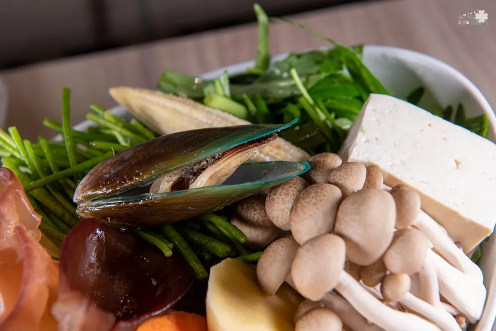 豐富的菜盤裡沒有火鍋料,全都是非常養生的新鮮蔬菜,包含海帶、豆腐、紅蘿蔔、玉米筍、水蓮、金針菇、地瓜、高麗菜、鴻喜菇、木耳以及爪哇翠綠貝等等,會依據時節做部份更動,比較特別的是爪哇翠綠貝與水蓮,爪哇翠綠貝有先處理過,所以只要燙熱了即可食用,鮮甜的滋味有點像淡菜,而水蓮基本上不常見於火鍋菜盤說,算是比較令人驚艷的地方。