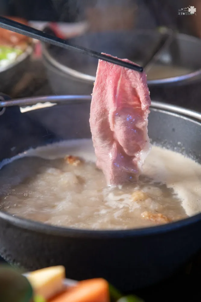 美麗的大理石油花分佈非常均勻細緻,在白蘭地湯頭中汆燙個3至5秒,馥郁的酒香帶起牛肉的清甜,細緻綿密的油花在舌尖化開,在唇齒之間交舞出幸福的愉悅感,雞湯大叔的招牌湯頭真不是蓋的,白蘭地燉雞湯跟Prime板腱牛根本就是絕妙組合。