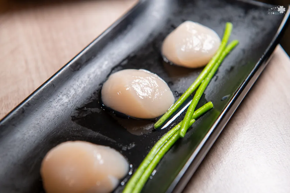 北海道干貝在普羅旺斯雞湯中川燙個1分30秒,那海味與酸味的交融濃縮,肉質細嫩彈牙,咀嚼間與牙齒之間欲拒還迎的曖昧感受,不僅有層次還多了點趣味。