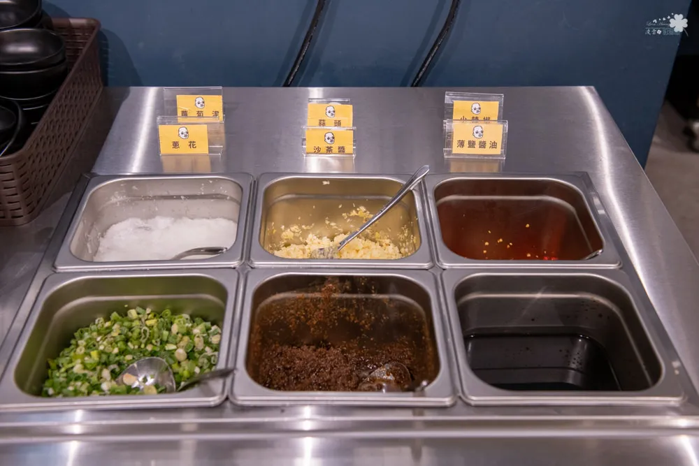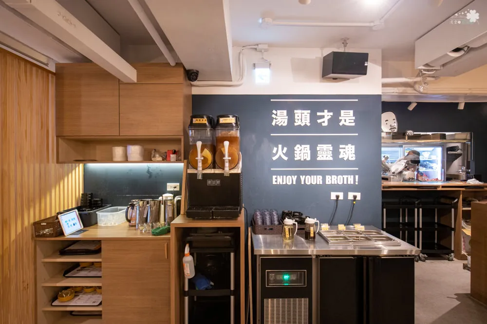 醬料與飲料吧設置在中間位置,上頭清楚標明店家的主題:【湯頭才是火鍋靈魂】,雞湯大叔準備的醬料共有蔥花、沙茶醬、薄鹽醬油、蘿蔔泥、蒜頭、小辣椒以及黑白醋供顧客搭配選用,另有無糖麥茶與檸檬冬瓜冰沙無限供應。