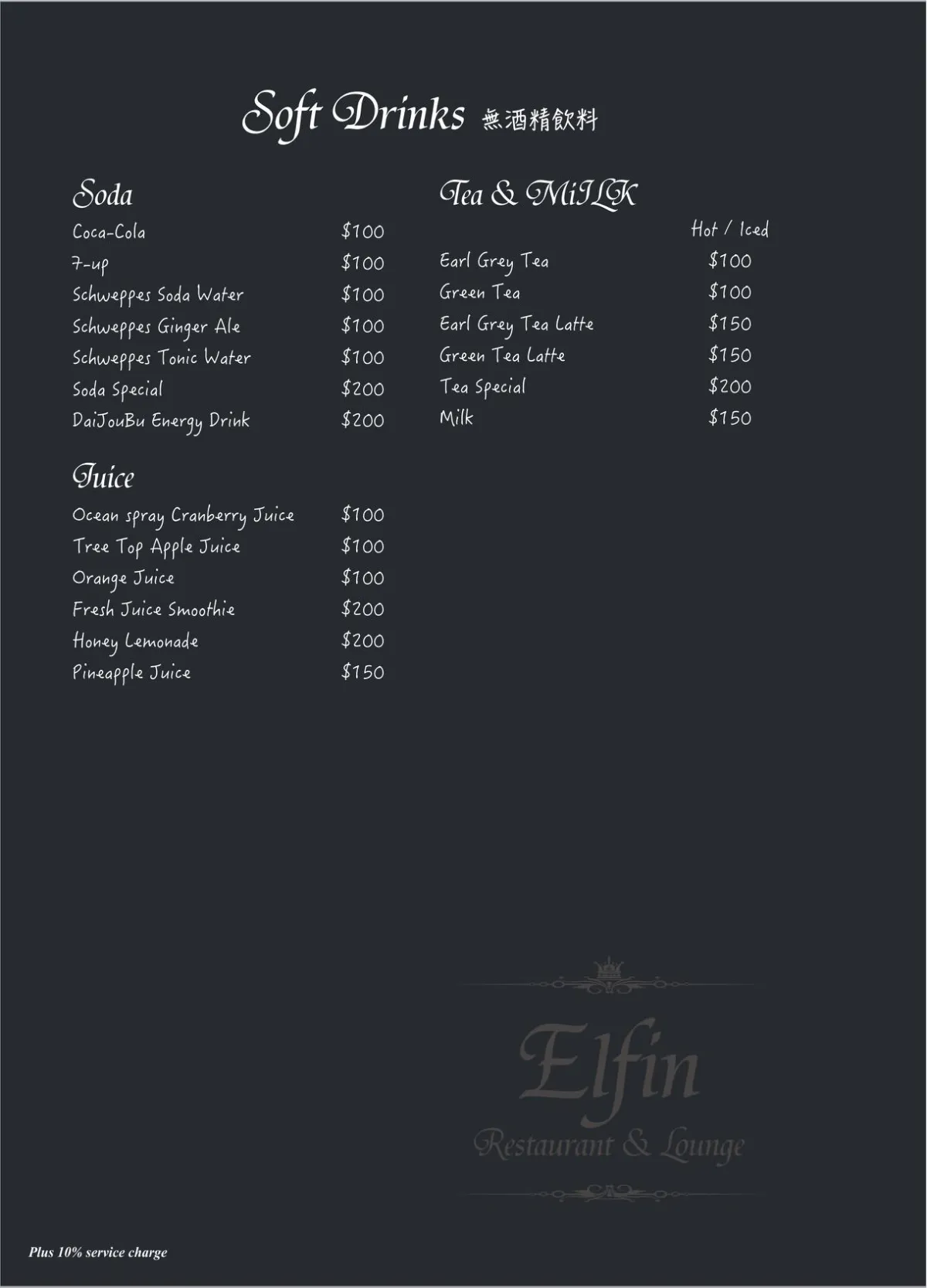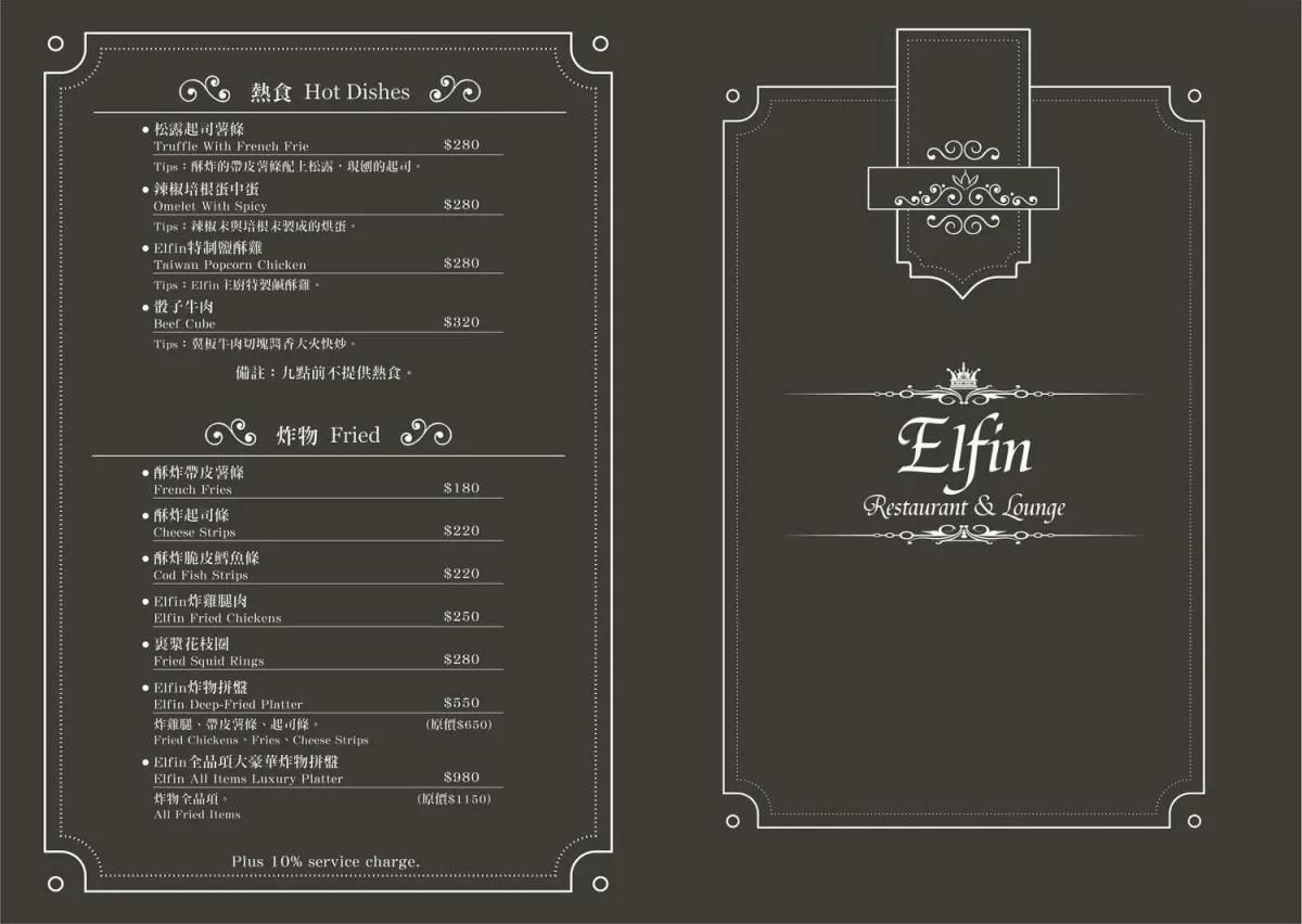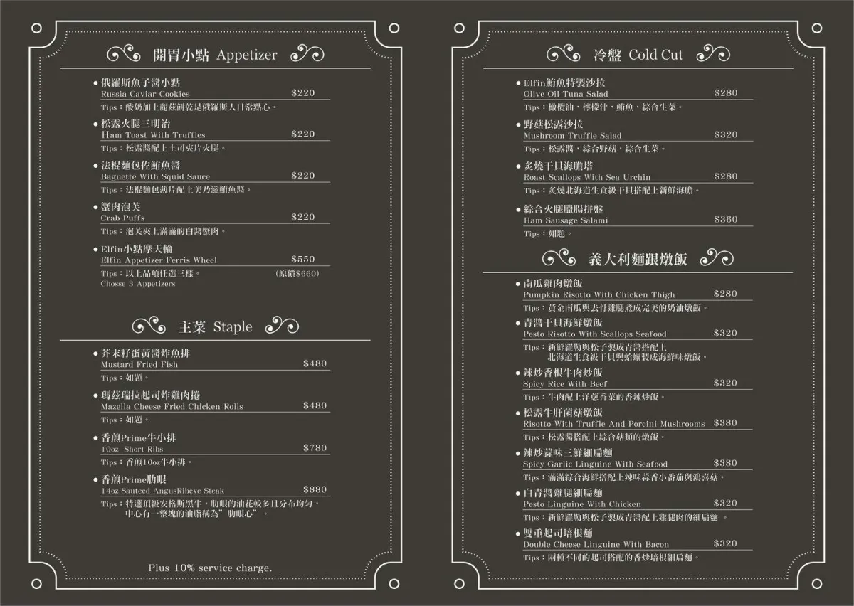 Elfin的Menu相當有質感,在調酒的部份對於內容解說的相當詳盡還帶意境,單點的部份有冷盤、熟食、義麵、燉飯、炸物與排餐,套餐類的則因應不同的需求,有小酌、雙人主食與多人主食等套餐組合,精靈餐酒館也有提供非酒精飲料。