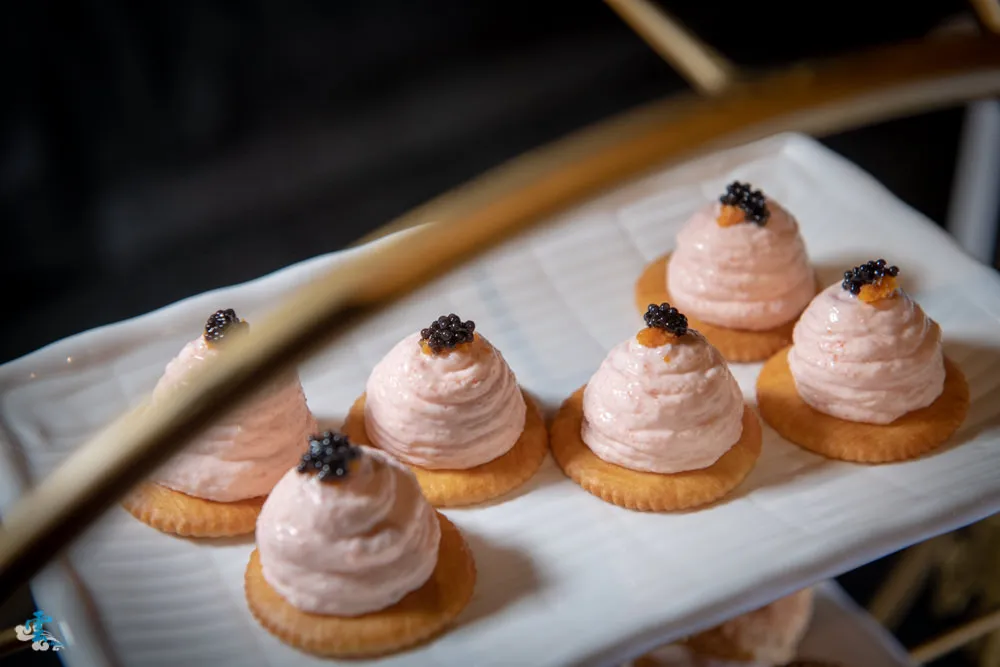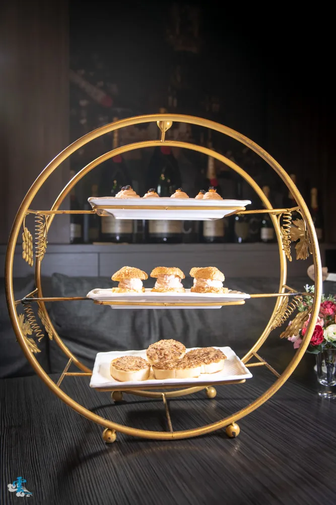 愛情摩天輪感覺是前陣子很夯的話題,Elfin的金色摩天輪也絕對可以帶起美味的精彩話題,三層各自有著美味的深層表述,分別是俄羅斯海膽魚子醬小點、法棍麵包佐鮪魚醬與蟹肉泡芙。