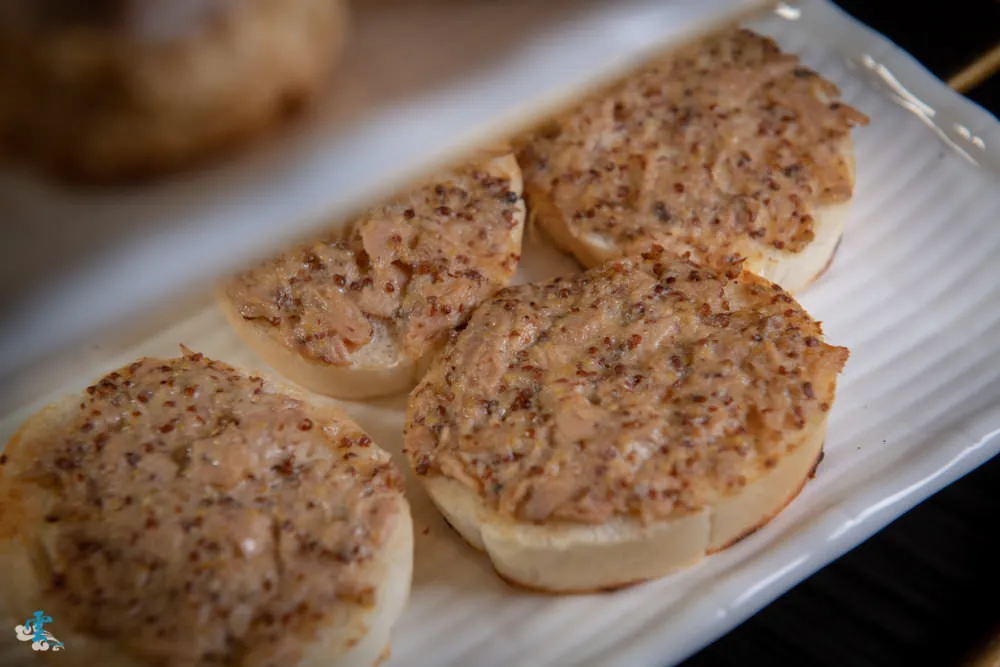 烤過的法棍麵包切片金黃酥脆,鋪上厚厚的一層鮪魚醬,輕盈不膩的好滋味。