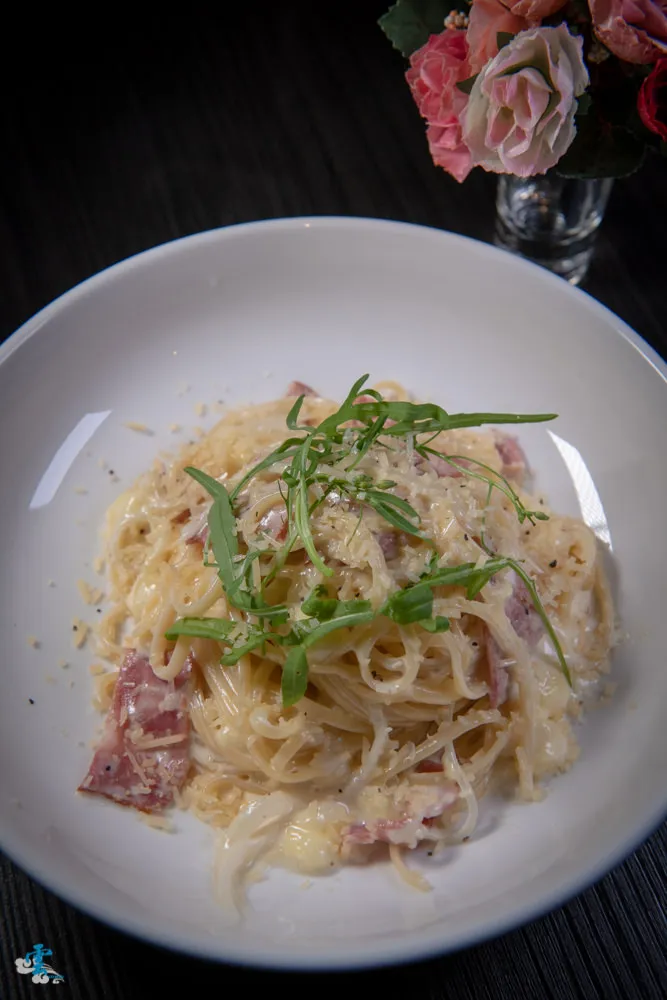 雙重起司並非是Double起司,而是使用高熔點起司、帕馬森起司兩種起司混合而成,不只味道協調,也讓起司的風味更添濃厚的層次,那濃郁的起司香氣牽引著味蕾,酥脆的鹹香培根微微托起起司的香甜,真是讓人飽足馥郁的美妙好味道。