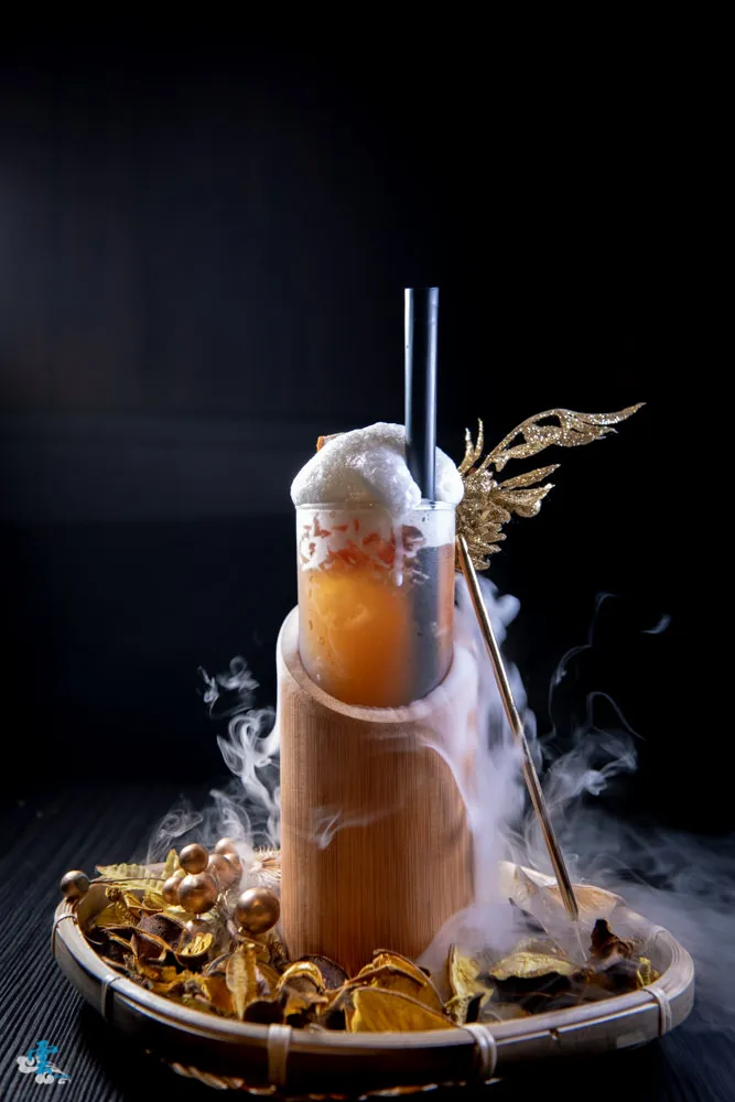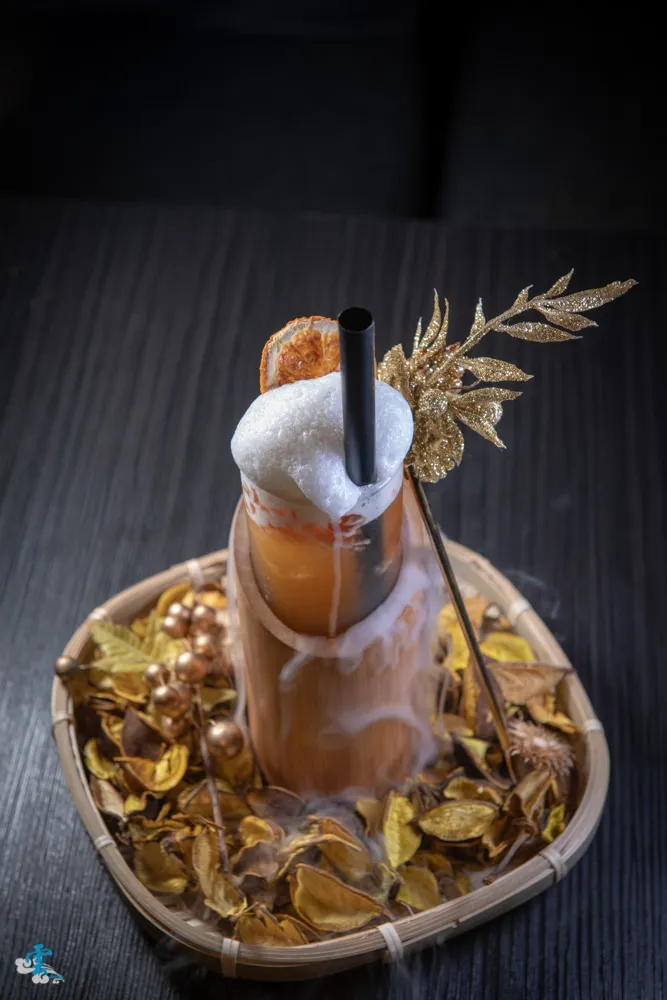 》杏枝 Luck Bar 下面鋪滿了金色的乾燥花,象徵著精靈應允之地,基底酒是伯爵茶泡的琴酒與伏特加,配上茉莉花茶凍與鹹奶泡增加整體味道的厚度與口感,茶與酒的微妙組合,蜜與奶的完美搭檔,入喉後那不同層次的口感與味道層層交疊,相當耐人尋味。 溫馨提醒:未滿18歲請勿飲酒。