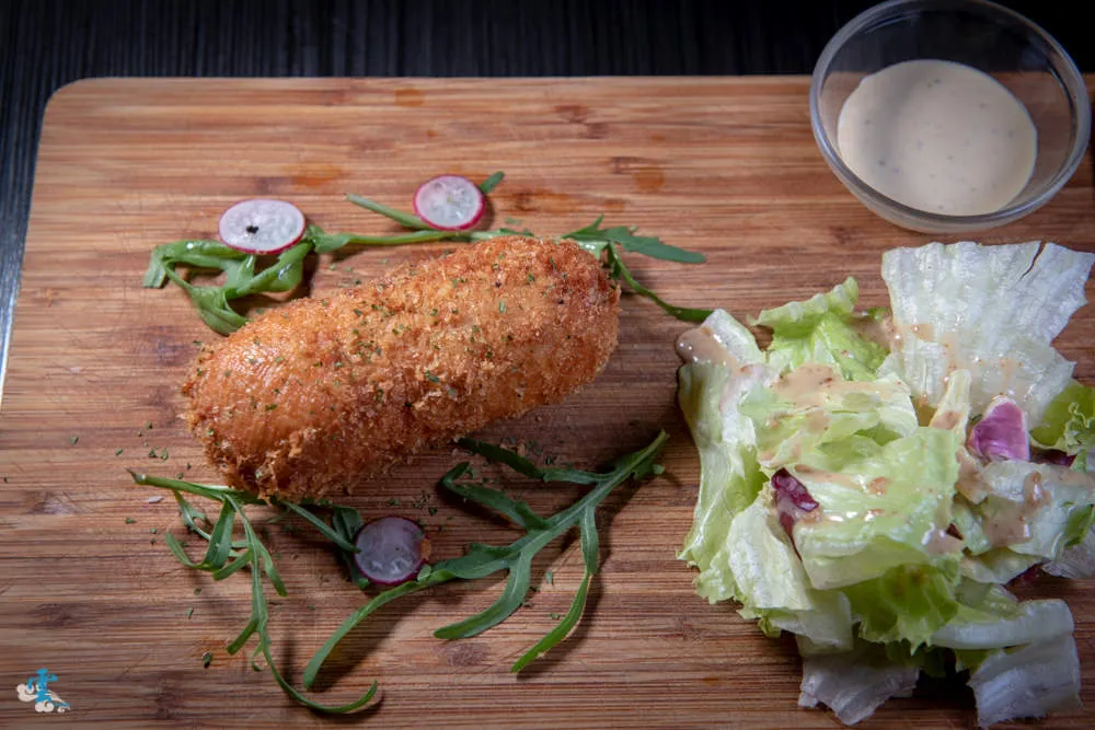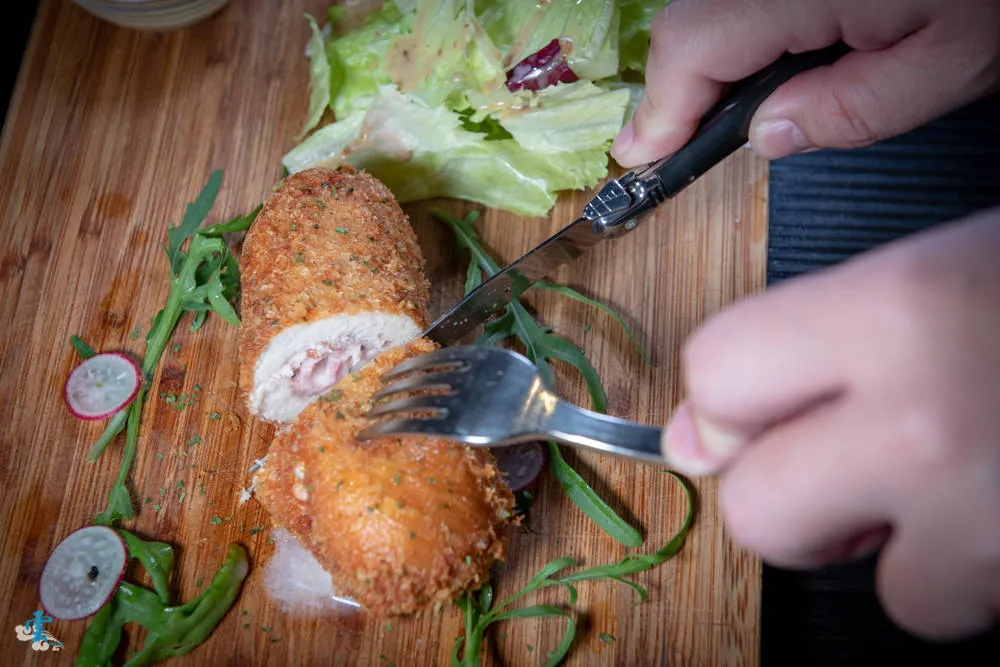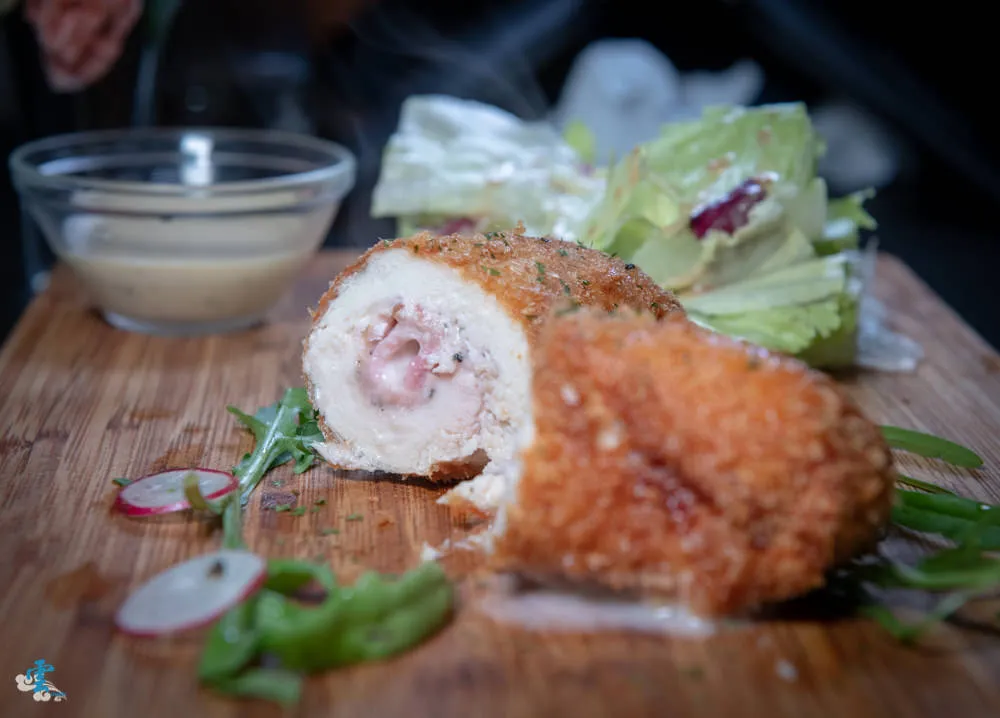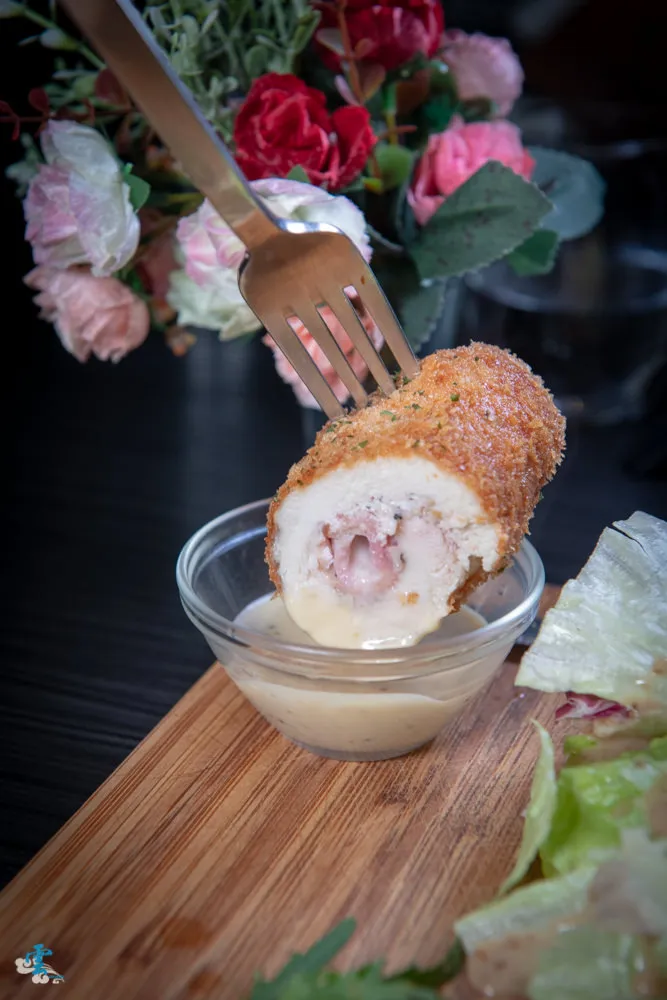 這是每日限量的餐點,因為製作程序繁瑣且有可能失敗的風險。切的時候要小心因為他會爆漿,裡面是整塊雞肉切薄片之後,捲上瑪茲瑞拉起司,然後真空包裝後放入舒肥機,舒肥完之後再冰一個小時才下鍋油炸,無怪乎會是每日限量的人氣餐點。金黃酥脆的外皮包裹著爆漿濃香的起司與鮮嫩多汁的雞肉切片,多層次的滋味交融在嘴裡瞬間爆發,徹底寵壞饕客的味蕾。