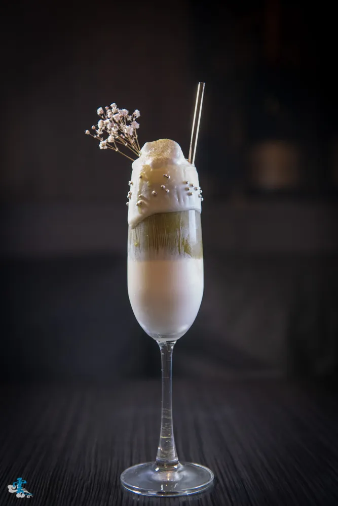 他是使用抹茶粉的特調,甜度來自於蜂蜜梅酒與巧克力利口酒,上面的白巧克力裝飾可以用湯匙直接與酒體攪拌,白巧克力上的銀珠裝飾是可食用的,微苦清香的抹茶,搭配香甜絲滑的白巧克力,餘味細長,堪稱可以喝卻有機會醉的甜點。