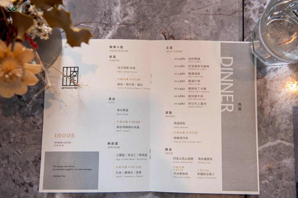 十方長私廚除了每一季的固定菜單以外,也會依照客人不同的需求給予專屬的客製化料理,也提供私人包場等量身訂做的服務。很年輕的主廚很早就出道,大學時期就開始四處征戰比賽,獲得無數獎項的肯定,在經過多年的法式料理薰陶之下,廚藝更佳精進,期望能在這個領域擁有自己的一片天空。店內的菜苗都不是使用進口的,全都用本土的食材,像花是產自南投,充分利用在地的食材是主廚的堅持,每一道菜色背後的工時都很長,但是得到的成果真的相當優質。