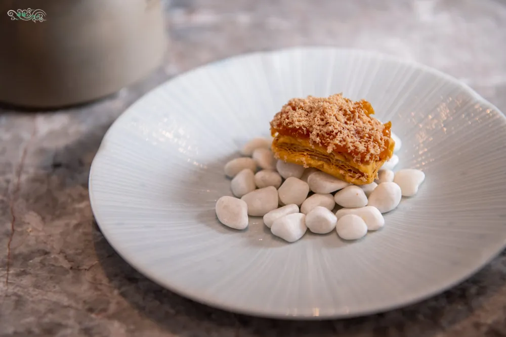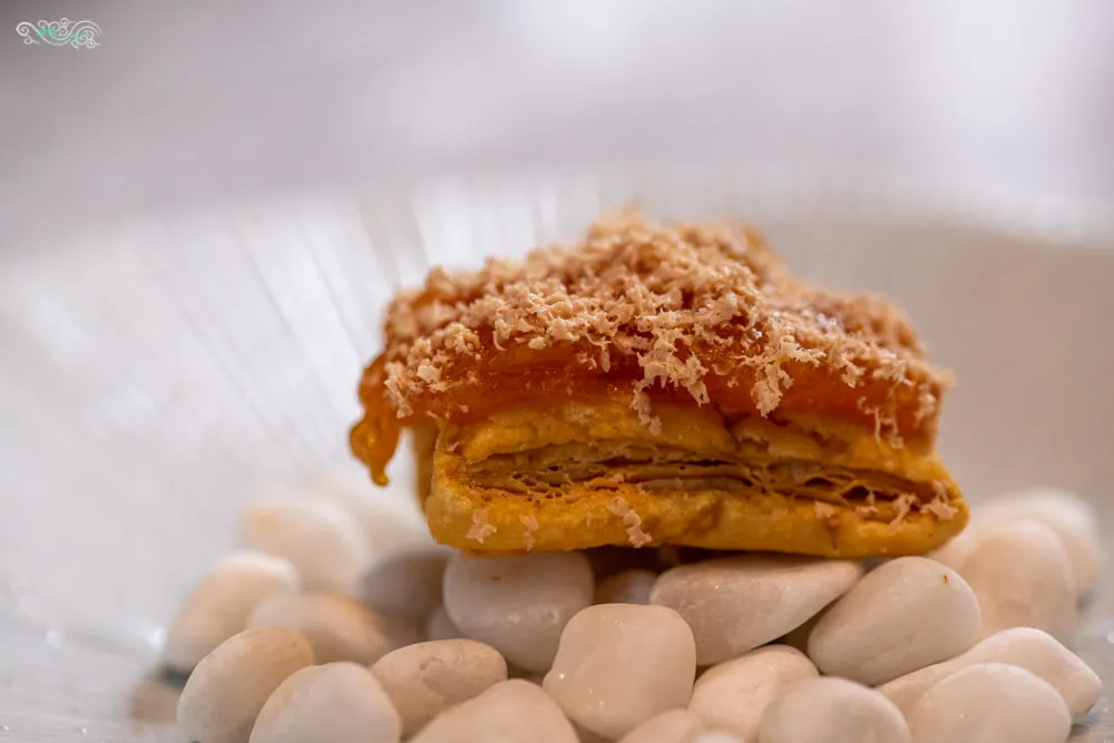 在自製的酥皮上撲滿茂谷柑橘果醬,灑上滿滿的鴨肝慕斯,這是一道洋溢著熱情,流露出奔放的開胃小點。直接一口咬下,茂谷柑橘果醬散發豐富濃郁的香氣與甜味,綿細柔滑的鴨肝慕斯豐富了味覺的深度,千層酥的酥脆口感讓整體滋味更加立體。